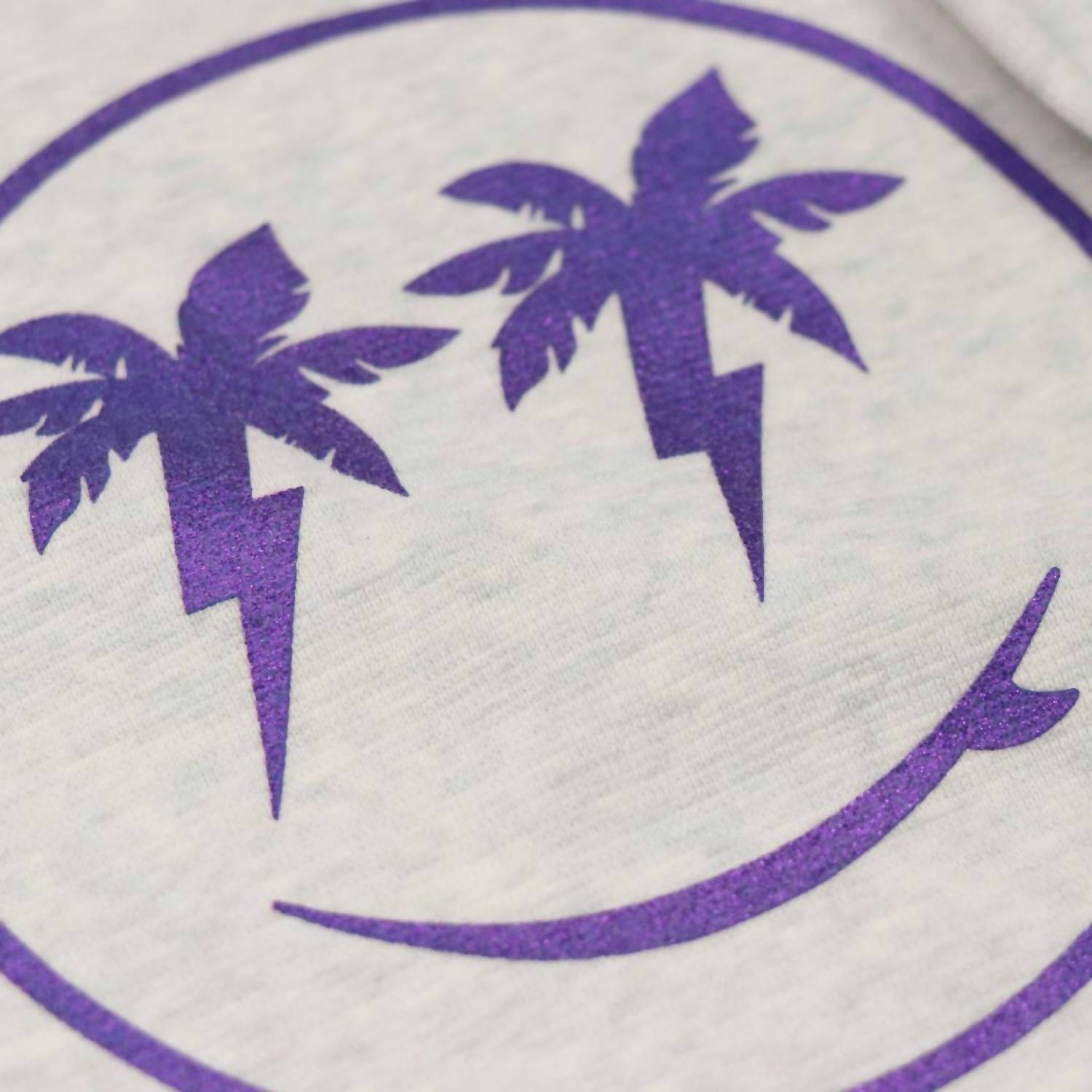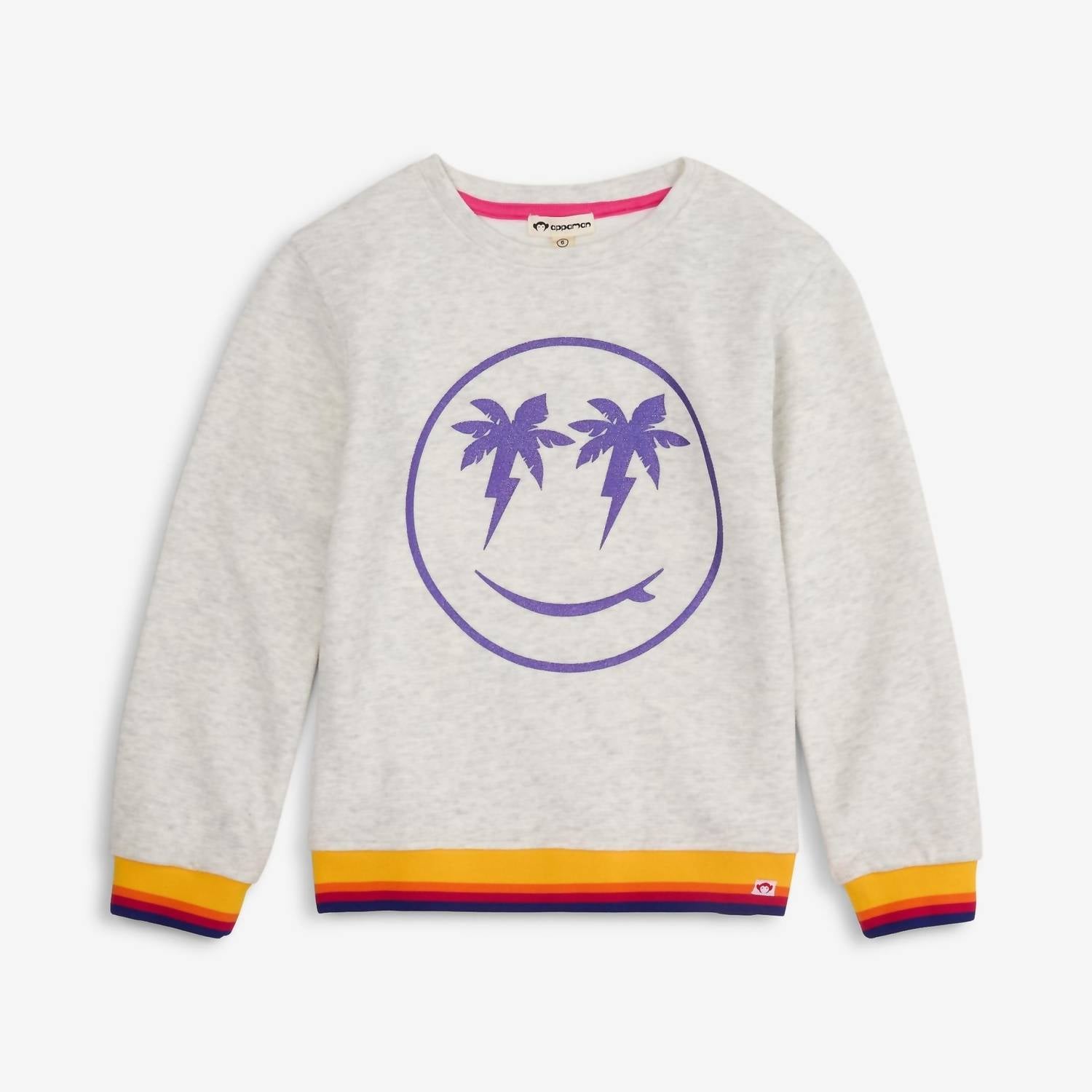Introducing the Appaman Ruby Sweatshirt in Cloud Heather, a playful addition to brighten any child's wardrobe. This long sleeve graphic sweatshirt features a charming smiley face crafted from palm trees and a surfboard grin, perfect for fall travel or Halloween festivities. Made from a 60% cotton, 40% polyester blend, this imported piece offers a cozy crewneck fit with pull-on closure. Care is simple with instructions to wash/dry inside out, machine wash cold, and tumble dry low.