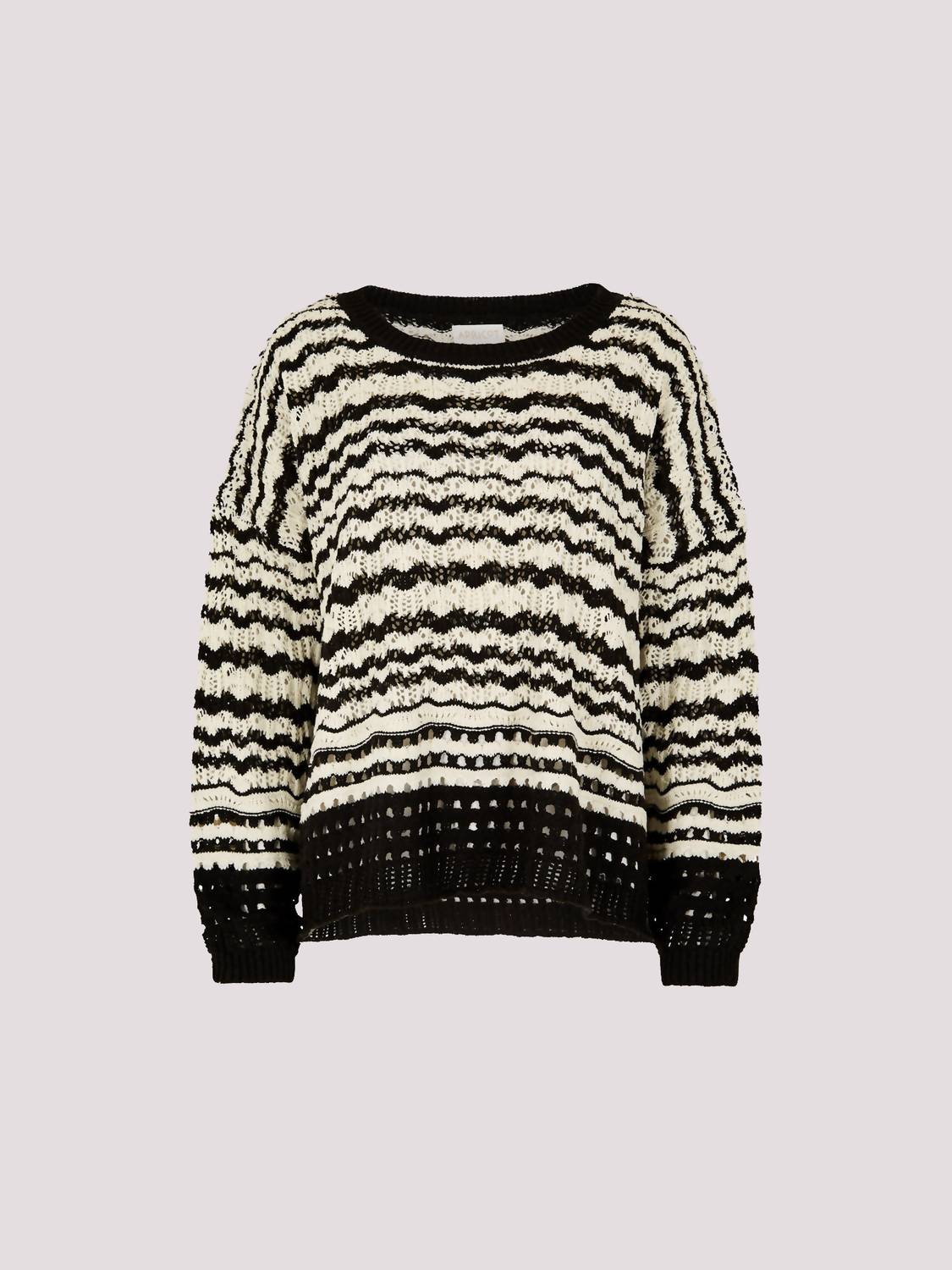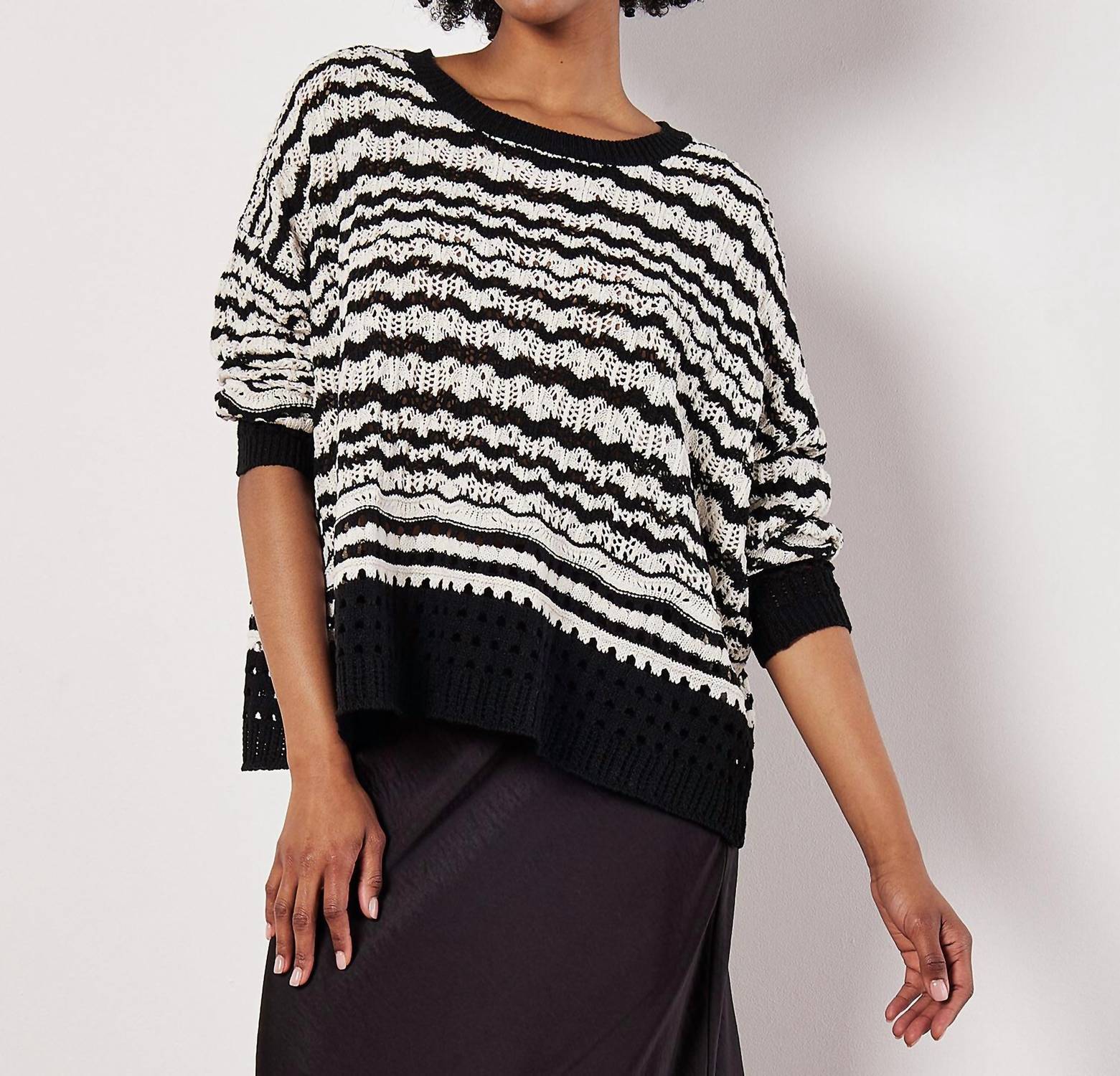 Experience the perfect blend of comfort and style with this trendy crew neck sweater, designed to effortlessly elevate your wardrobe. Pair it with your favorite denim and loafers for the perfect look. This lightweight crochet jumper features a boxy silhouette and classic stripe design. It has a crew neckline, long sleeves, pointelle detailing, and contrast trims. Made from 50% acrylic and 50% polyester. Approx. 22.44" in length. Hand wash only (cold).