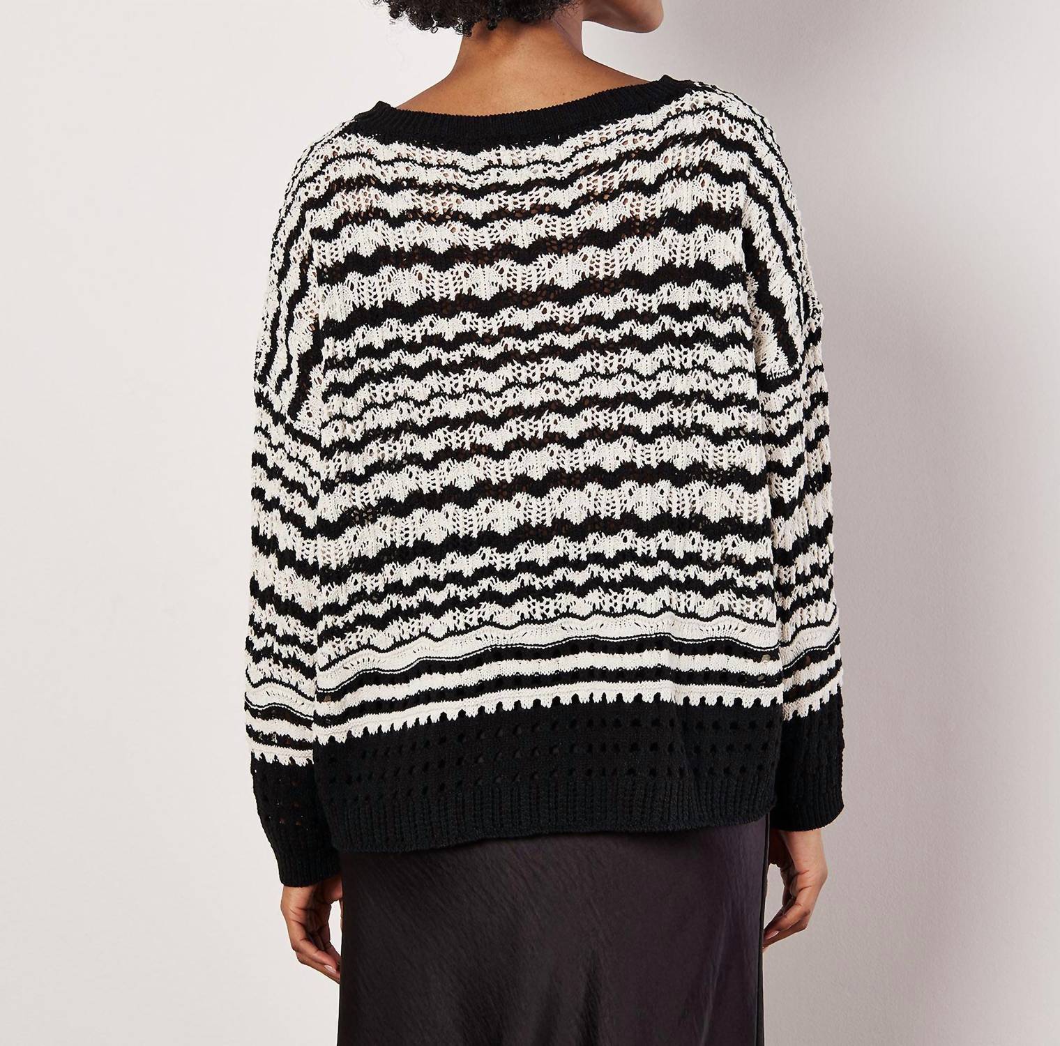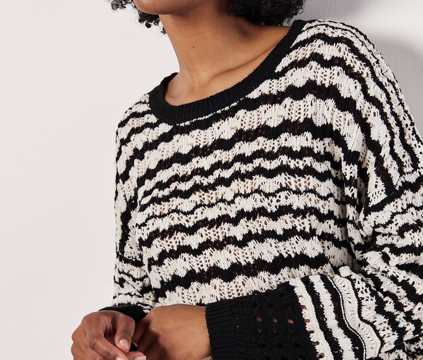 This lightweight crochet jumper features a boxy silhouette and classic stripe design. It has a crew neckline, long sleeves, pointelle detailing, and contrast trims. Made from 50% acrylic and 50% polyester. Approx. 22.44" in length. Hand wash only (cold).