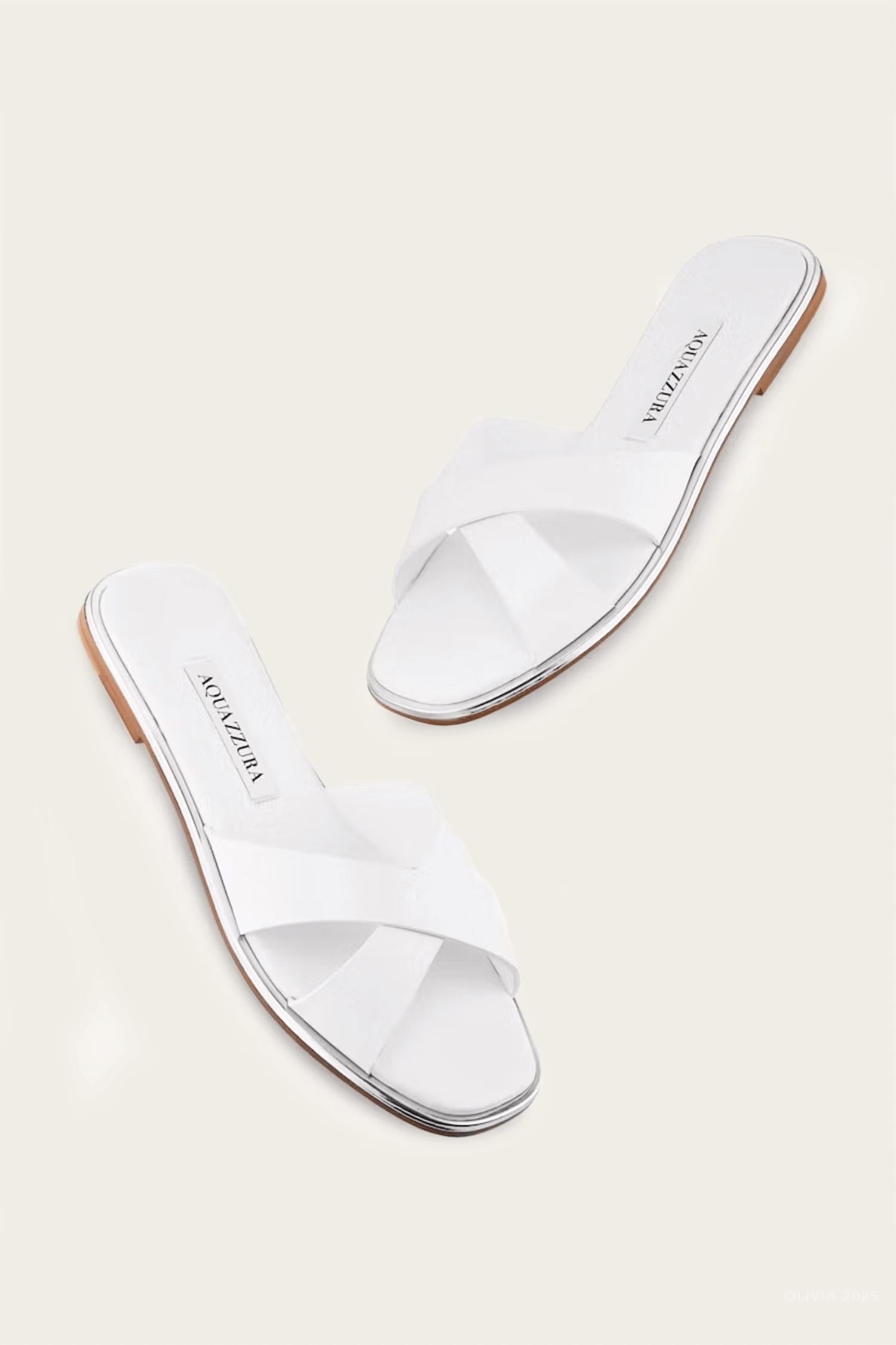 Step into summer elegance with the Women's Divine Slide by Aquazzura, an exquisite creation meticulously crafted in Italy. This white sandal is designed for ease with a slip-on style, featuring a chic crossover strap at the toe, perfect for laid-back luxury. With a full leather construction, the upper is made from 100% crossbred leather, the lining is goat leather, and the sole is calf leather, ensuring durability and comfort. Embrace a refined touch with a branded leather insole and a flat heel design, designed in a fashionable open toe shape.