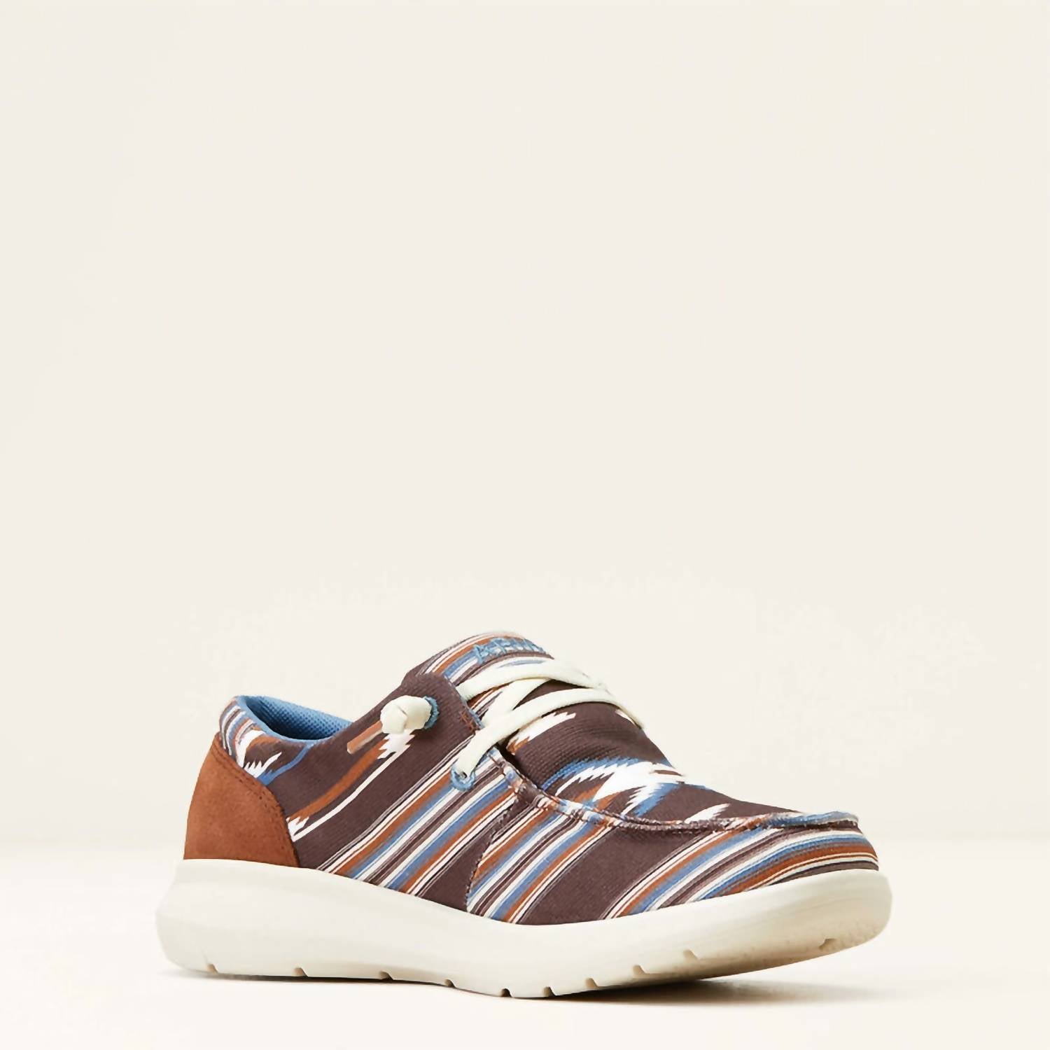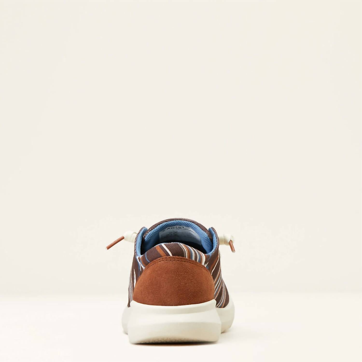 Cute, functional, and comfortable. These sneakers check all the boxes. Experience the unique blend of comfort and style with ARIAT's Chimayo Hilo sneakers in Arroyo Chocolate. These slip-on shoes exhibit a charming Chimayo print in hues of chocolate, chestnut, cream, and blue, complemented by cream-colored laces and blue lining. They feature a flat heel design with a cushioned insole and rubber soles for all-day comfort. Please note these sneakers run a half size small, so consider sizing up for the perfect fit.