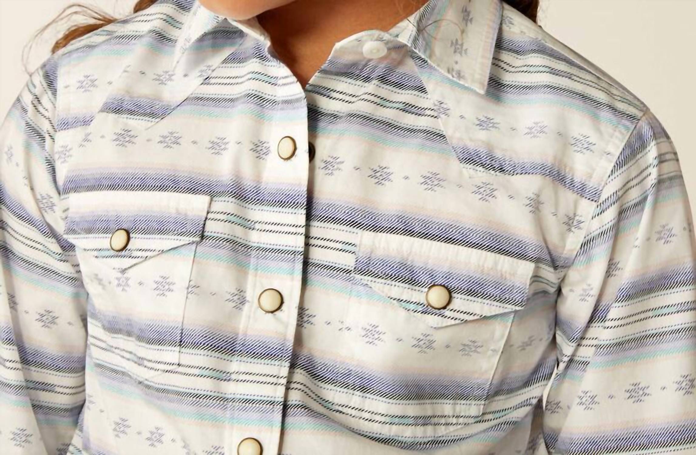 Introducing the Girl's Alyssa Long Sleeve Snap Shirt by ARIAT, perfect for every budding rodeo star. Crafted from 100% cotton, this patterned shirt in Geo Stream Serape features iconic Western style with a Western yoke detail and a front pocket with snap closure. Designed with a prewashed finish to minimize shrinking, this shirt seamlessly combines style and practicality. Care instructions include hand washing and laying flat to dry, ensuring it remains a staple in your little one's wardrobe.
