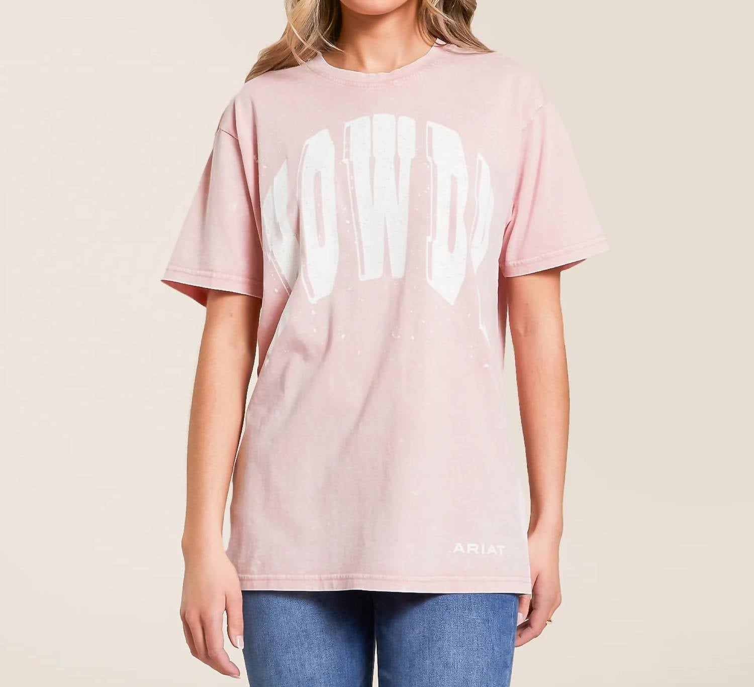 Look no further, you just found your perfect tee! Introducing the ARIAT Howdy T-shirt, a vibrant pink essential for your casual wardrobe, designed to add a touch of cowgirl flair. This short-sleeve tee is crafted from 100% cotton, featuring a loose fit with extra length for comfort. It boasts an eye-catching screen-printed graphic, and its 26.5-inch length provides a relaxed silhouette. With a convenient pull-on closure, it's prewashed to minimize shrinking, making it a durable choice for summer. Care: Machine wash and tumble dry.