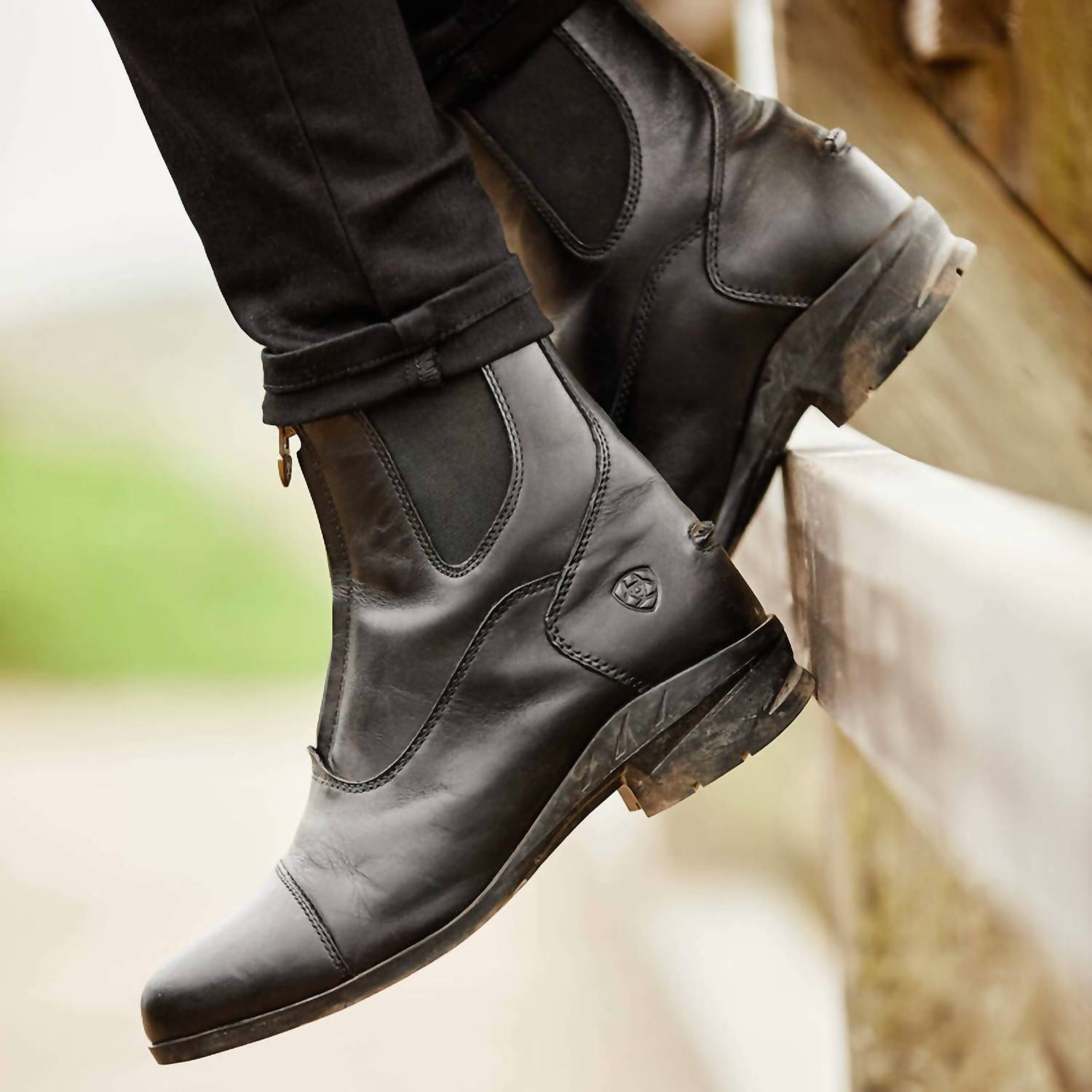 Introducing the ARIAT Women's Heritage IV Zip Waterproof Paddock Boot in classic Black, designed for peak performance and all-season wear. This boot features a full-grain waterproof leather upper and an antiqued brass YKK® zipper for ease and durability. Engineered with a 4LR™ lightweight stabilizing shank and a built-in heel cushion, it's further enhanced by a Duratread™ sole with rider-tested traction zones and an elastic twin gore. Ideal for those seeking true-to-size comfort, it boasts a stabilizing lateral motion control device, padded collar, and moisture-wicking lining for superior all-day support.