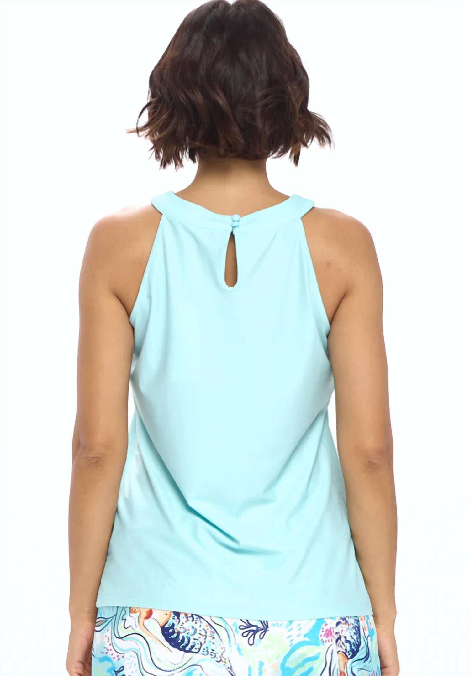 Fit, fabric and functionality. This tank top checks all the boxes. Chic addition to your spring travel wardrobe. Crafted from 80% nylon and 20% spandex. Crewneck top offers both comfort and flexibility. With a solid mint color and unique yoke cut out, perfect for any adventure from running errands to lounging poolside. Button closure. Hand wash.
