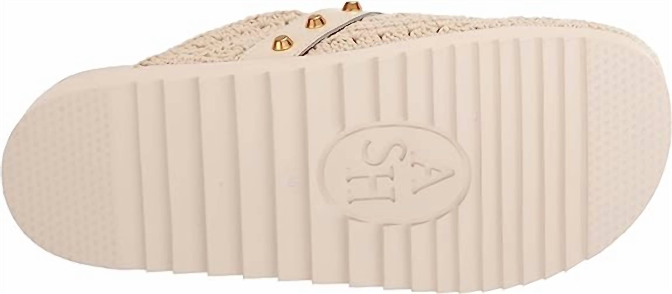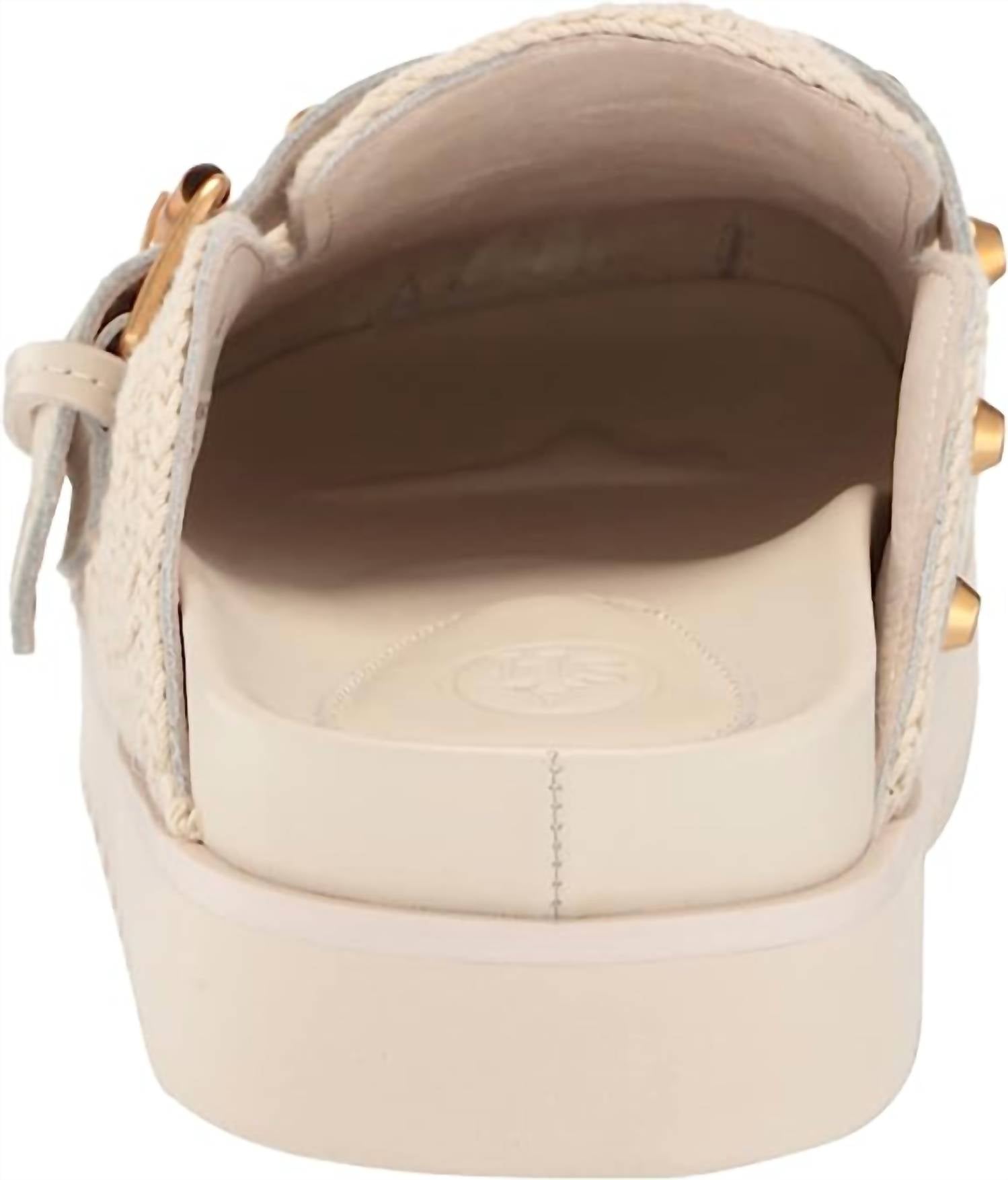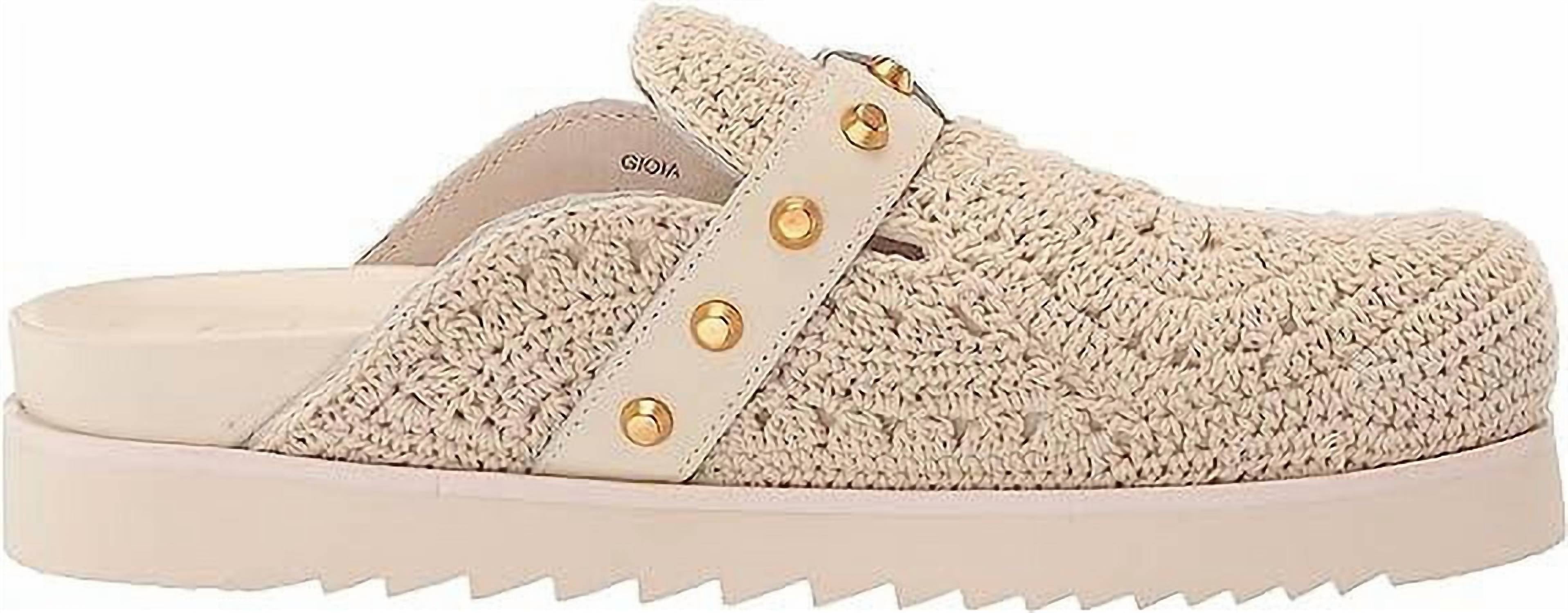 A trend that everyone is loving and this style might just be our favorite. Step into summer style with the Women's Buckle Strap Slip On Round Toe Clogs by ASH. These chic clogs in 'Talc' white feature a crochet embroidery upper adorned with gold studs, secured with a trendy side buckle closure for added flair. With a flat rubber sole and a comfortable round toe design, these are perfect for those seeking comfort without sacrificing style. Ideal for a boho chic look, they are crafted with quality in mind, boasting a sturdy sole and a branded insole, making them a standout choice for a dinner party or any summer gathering.