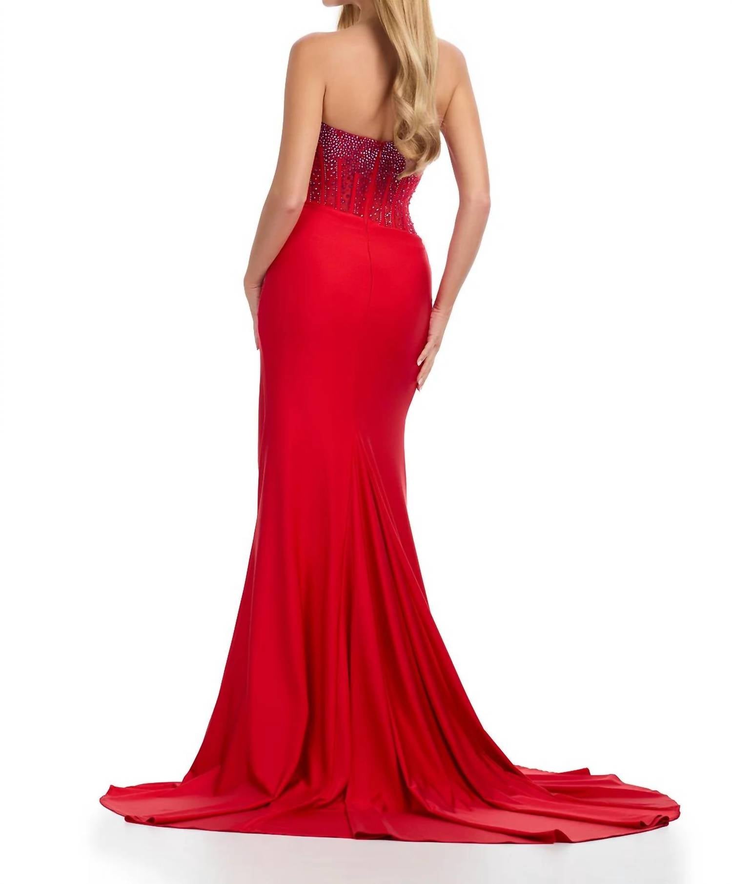 Make a statement at your next event with the ASHLEYlauren Stones Encrusted Strapless Gown in purple. This stunning mermaid silhouette gown is designed with a classy strapless neckline and features a corset bustier for a structured fit. The bodice boasts exposed corset boning, embellished with press-on stones for added glamour, while the ruched skirt adds an element of elegance. Closure: Zip closure. Perfect for prom or a New Year's Eve celebration.