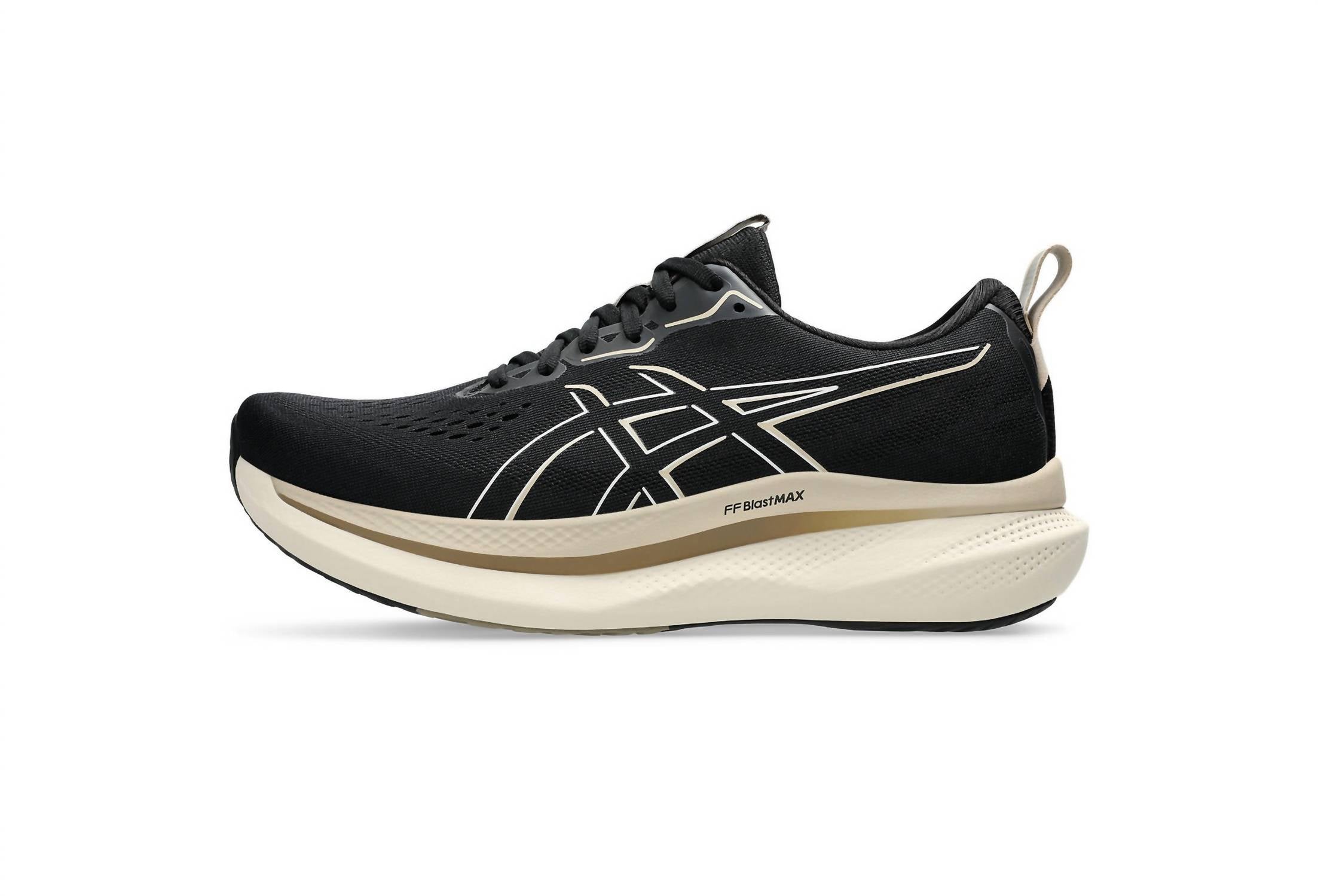 Introducing the ASICS GLIDERIDE MAX Running Shoes, crafted to enhance your long-distance runs with impeccable ease. In a sleek black/oatmeal colorway, these trainers boast advanced FF BLAST MAX cushioning, delivering remarkable softness and high energy return. The GUIDESOLE technology provides a rockered sole design for effortless toe-offs, complemented by an engineered mesh upper that maximizes breathability. Designed for men's athletic performance during fitness or workout sessions, these shoes are a spring athleisure trend essential.