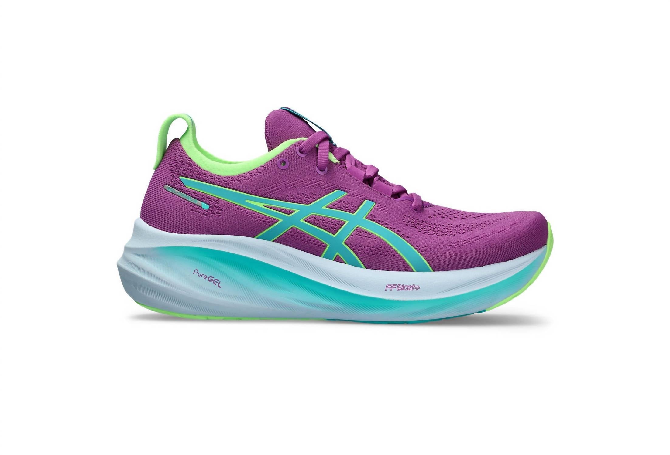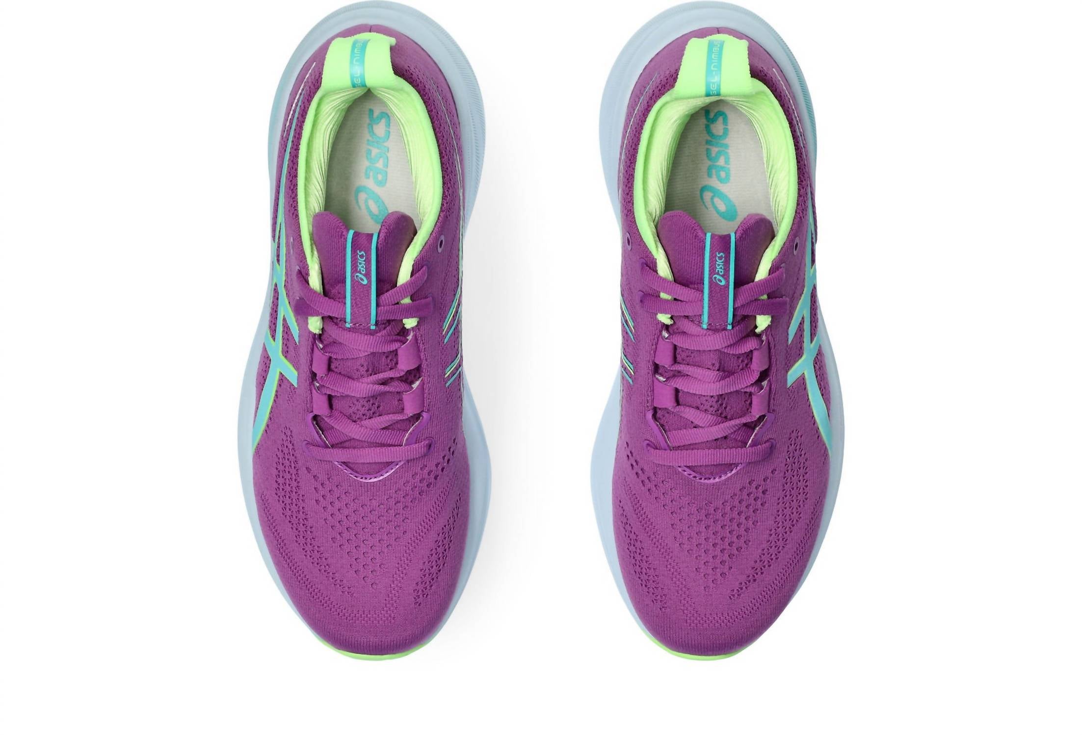 When fashion meets function. Experience the exceptional comfort and visibility of the ASICS Women's Gel Nimbus 26 Lite Show Sneakers, perfect for fitness enthusiasts. These athletic shoes in a striking purple and neon green feature a soft engineered knit upper for excellent ventilation and comfort, complemented by a knit collar and midfoot fit. Designed with FF BLAST™ PLUS ECO cushioning, they offer a lighter, softer feel while minimizing environmental impact. The HYBRID ASICSGRIP™ outsole, combining ASICSGRIP™ rubber and AHARPLUS™ materials, ensures excellent grip and durability across various terrains.