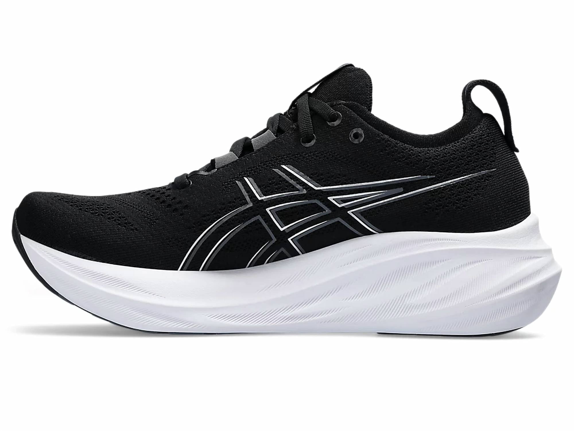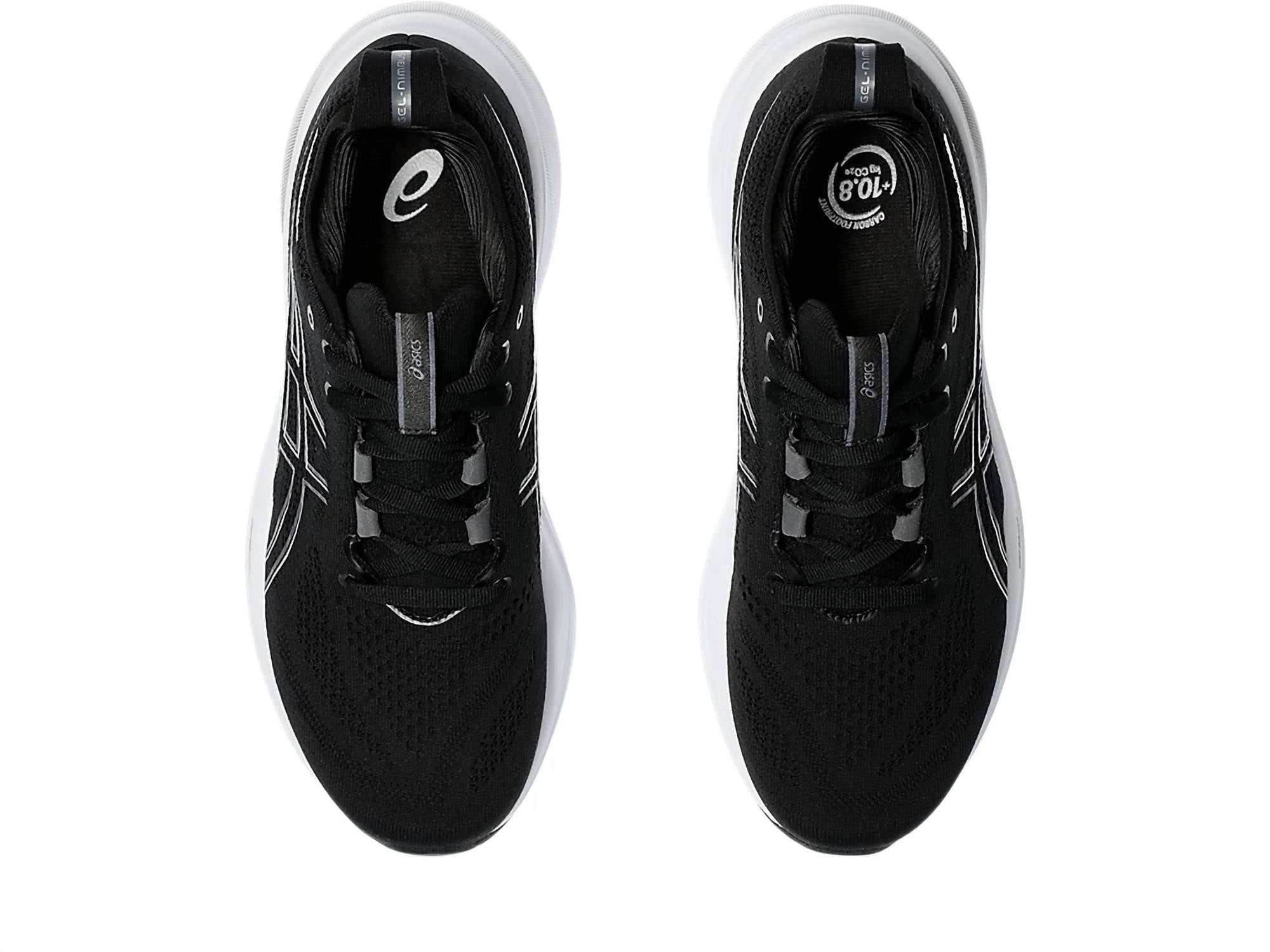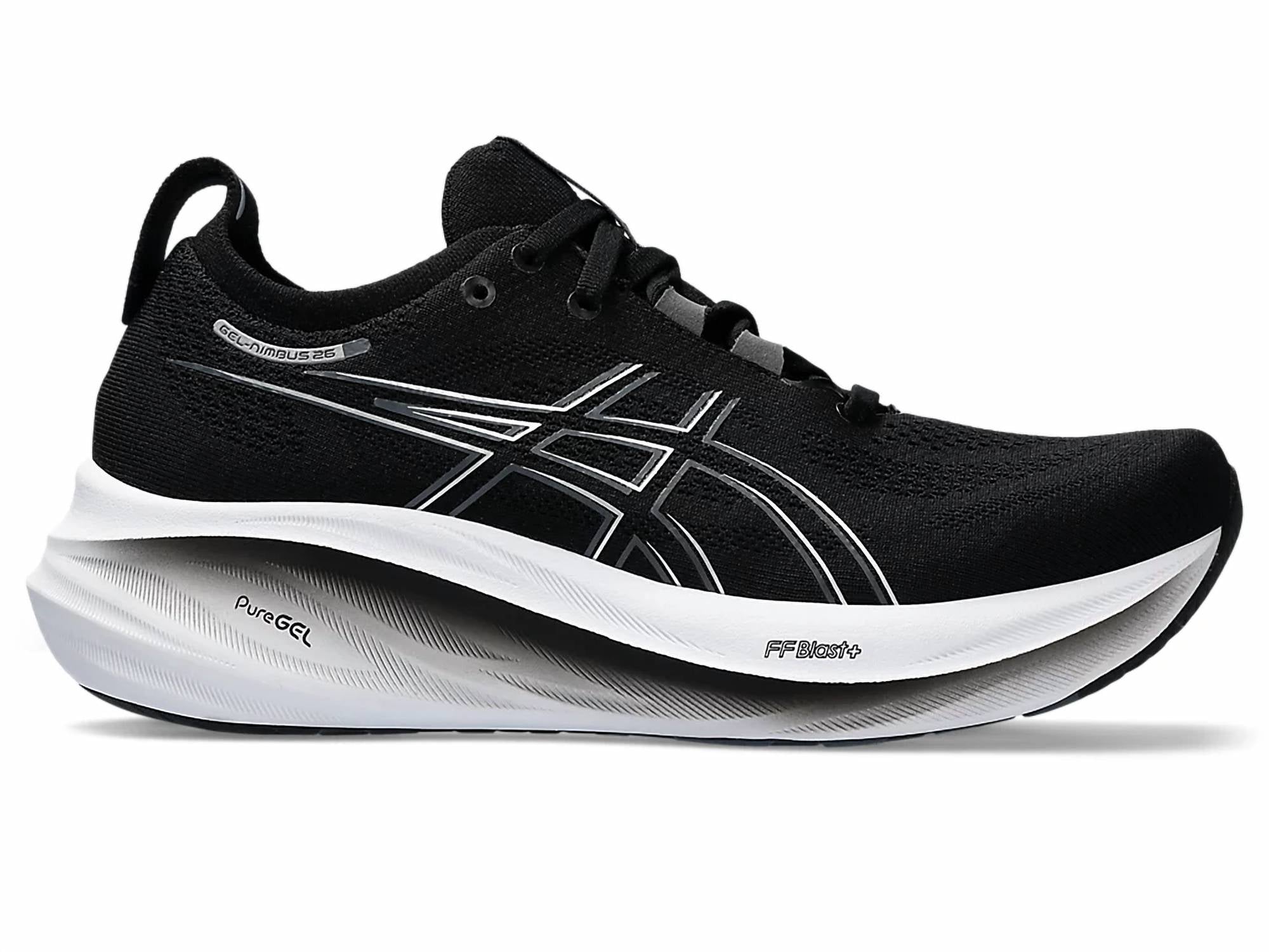 Stylish, comfortable and supportive. These athletic sneakers check all of the boxes. Elevate your run with Women's Gel Nimbus 26 Running Shoes by ASICS in classic BLACK/GRAPHITE GREY. Designed with an engineered knit upper, this shoe wraps softly around the foot, with over 75% of the main upper material made from recycled content for sustainability. The inclusion of PureGEL™ and FF BLAST™ PLUS ECO technology provides lightweight cushioning and enhanced support, while the OrthoLite™ X-55 sockliner ensures superior step-in comfort. Reflective details and a HYBRID ASICSGRIP™ outsole enhance visibility and grip, making these shoes ideal for various terrains.