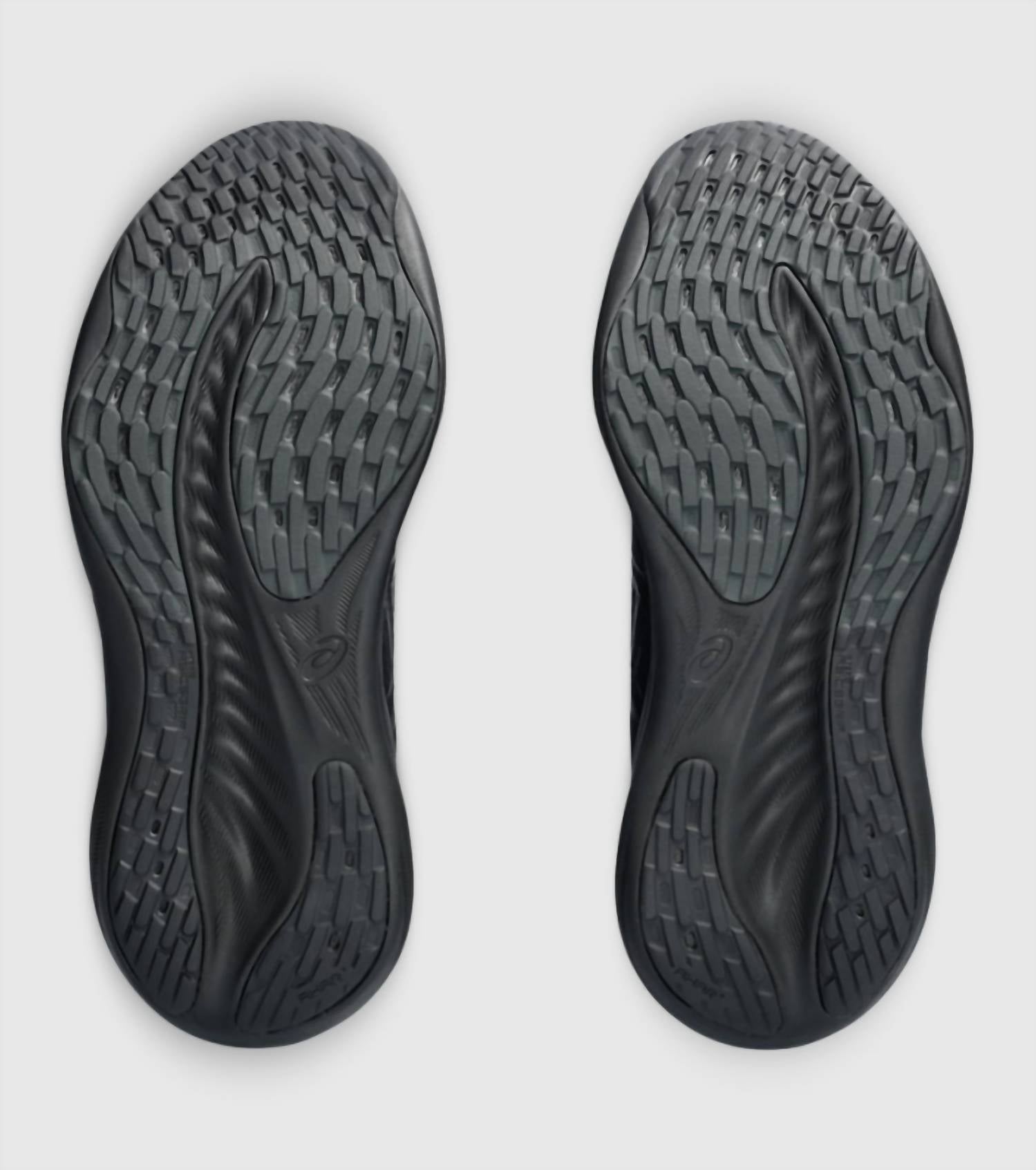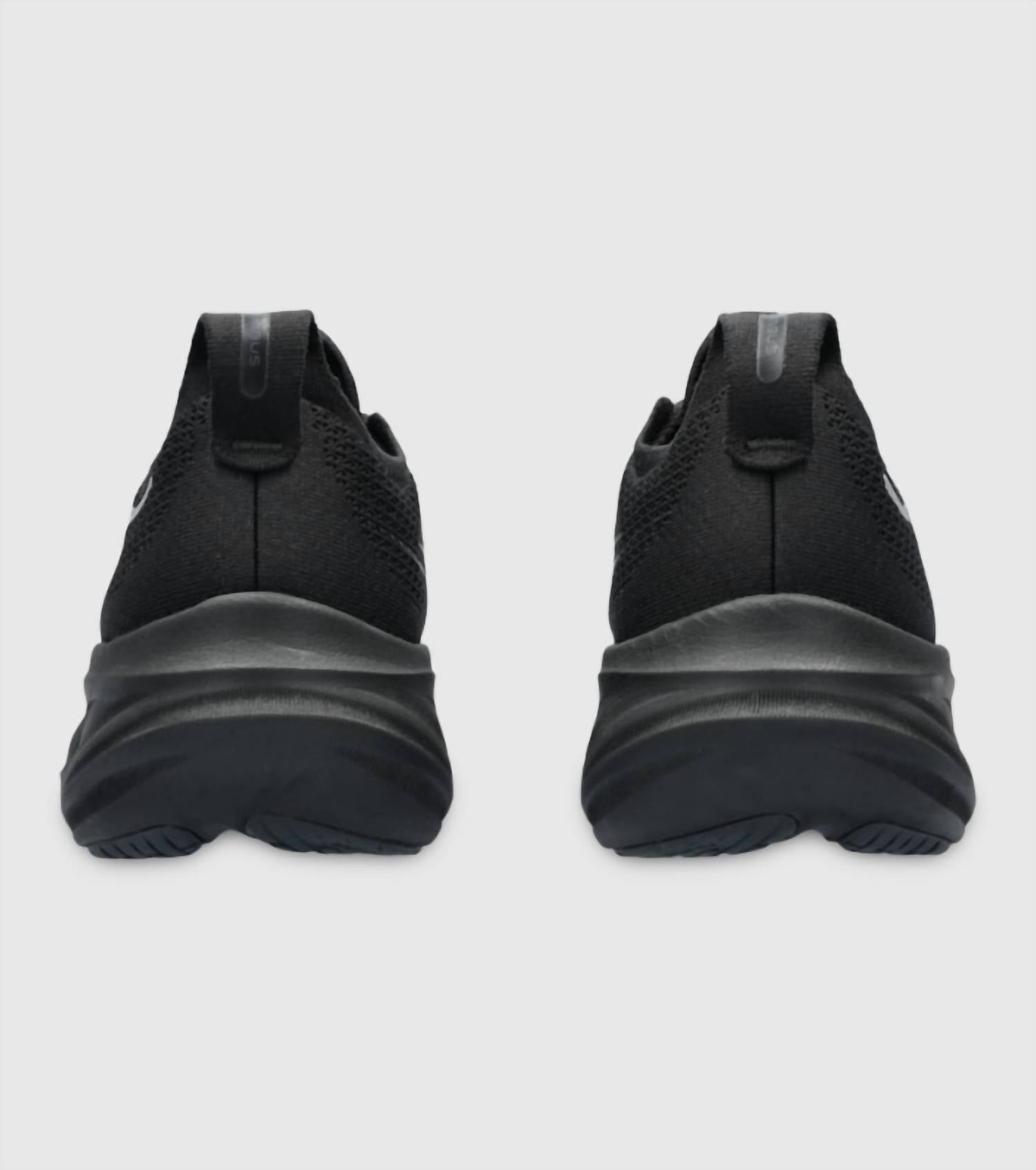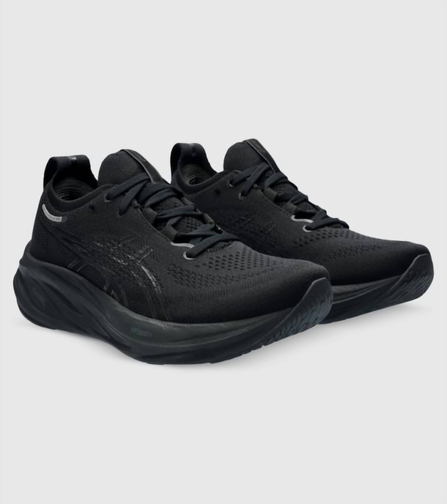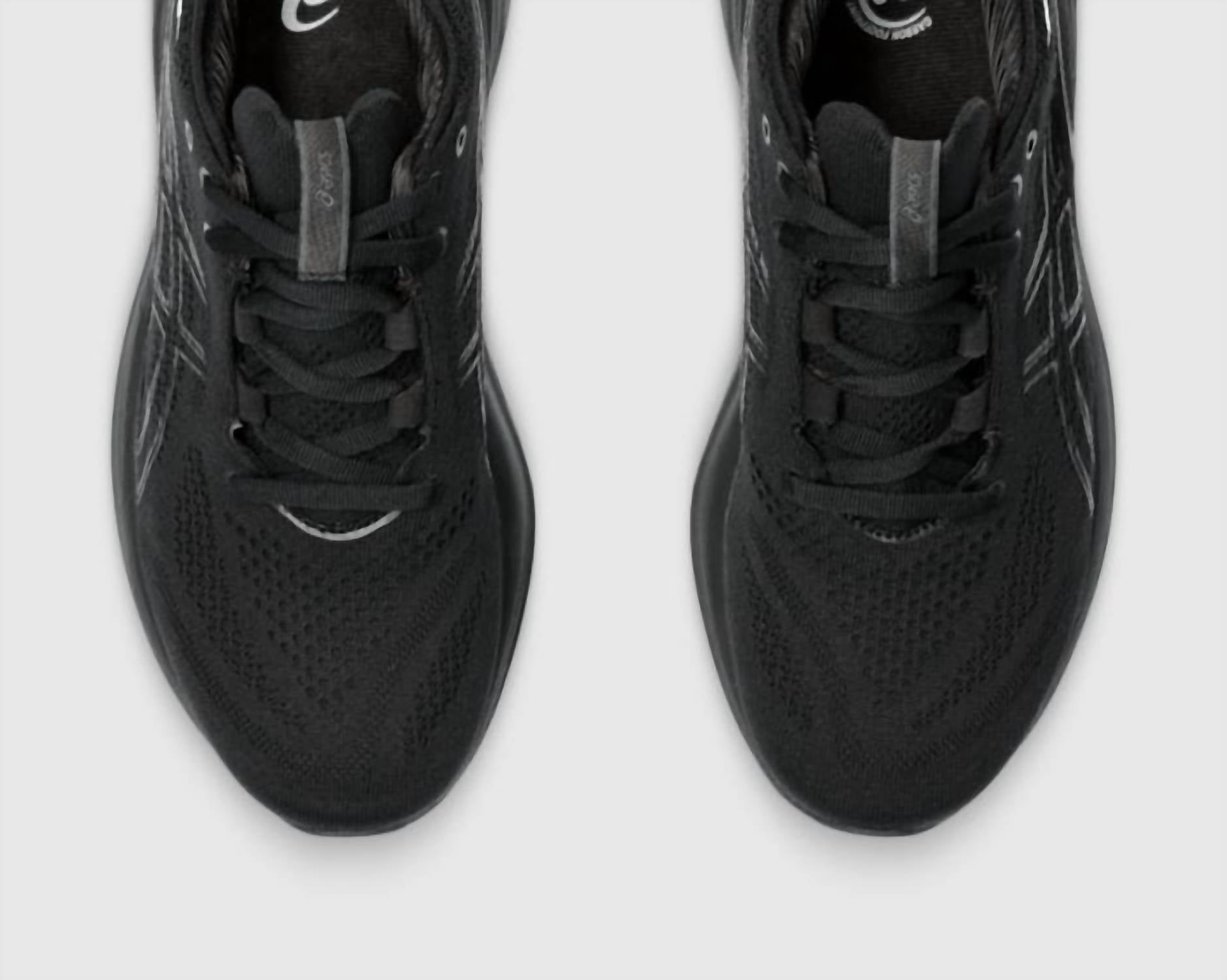 Workout in style with these adorable athletic sneakers. Introducing the Women's Gel Nimbus 26 Running Shoes by ASICS, a top choice for those seeking performance and sustainability. Crafted with an engineered knit upper, these shoes wrap the foot with softness, featuring over 75% recycled content to minimize carbon emissions. Enhanced with lightweight PureGEL™ technology and FF BLAST™ PLUS ECO technology, you'll experience softer landings and responsive toe-offs. Additional features include an OrthoLite™ X-55 sockliner for improved comfort, reflective details for better visibility, and ASICSGRIP™ outsole rubber for enhanced traction and durability. Designed in a wide fit, these black running shoes excel in low-light conditions and challenging terrains.