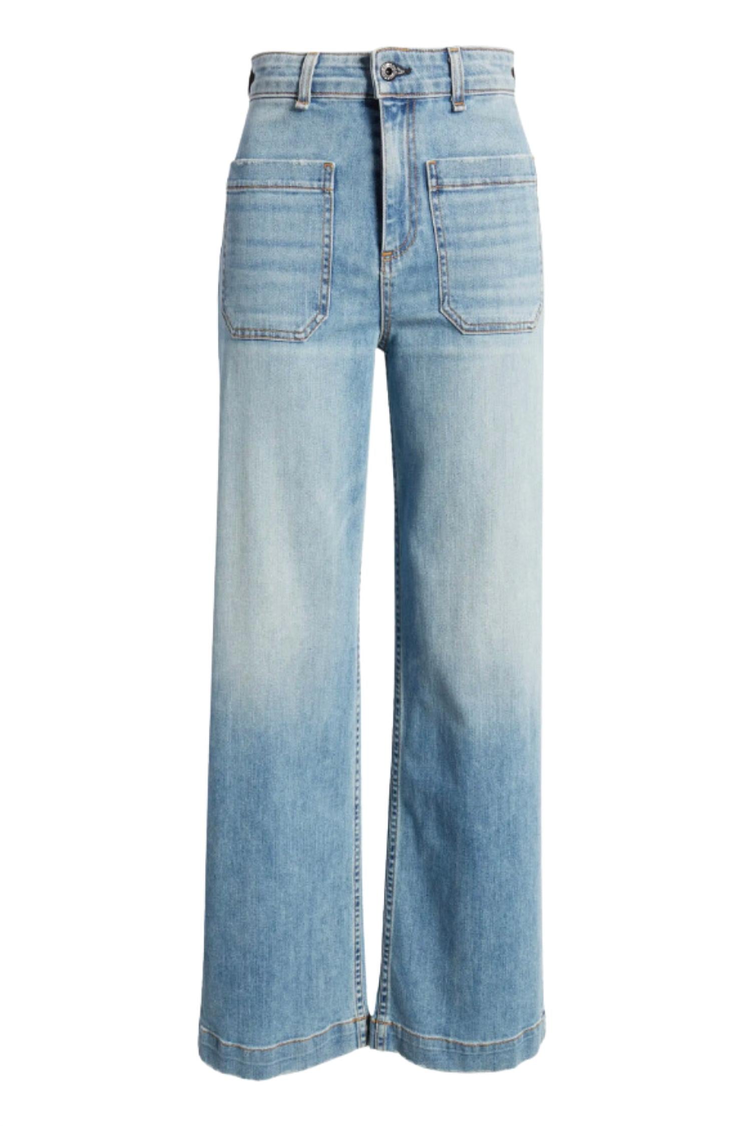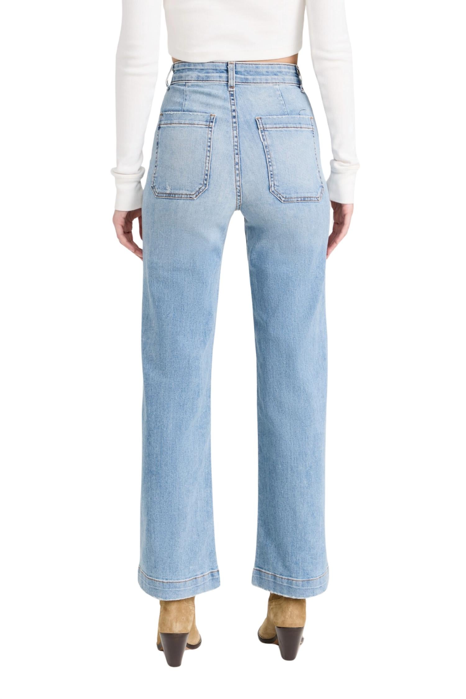 Pair these wide leg jeans with mules, slides or your favorite strappy sandals. Elevate your wardrobe with the Sailor Wide-leg Pant by ASKK NY, perfect for effortless style this fall. Crafted from a cotton blend with 98% cotton and 2% polyurethane, these pants feature a light-washed, relaxed-fit design with a high rise. They boast functional front patch pockets and a button closure, all made in the USA. With a 29.5" inseam, 22" leg opening, 14.5" front rise, and 16" back rise for size 32, they're both stylish and comfortable. Care is simple with machine wash and line dry instructions.