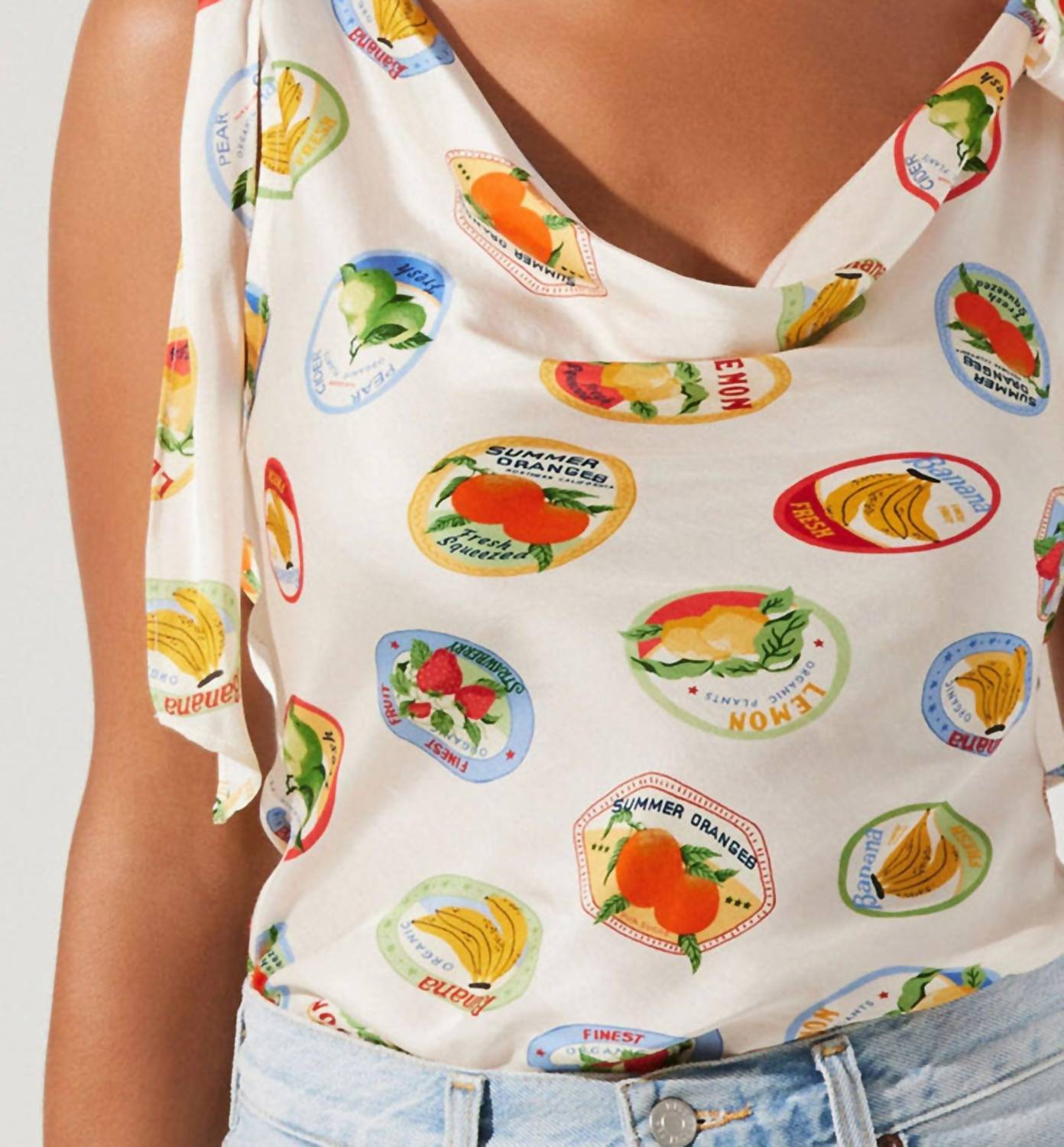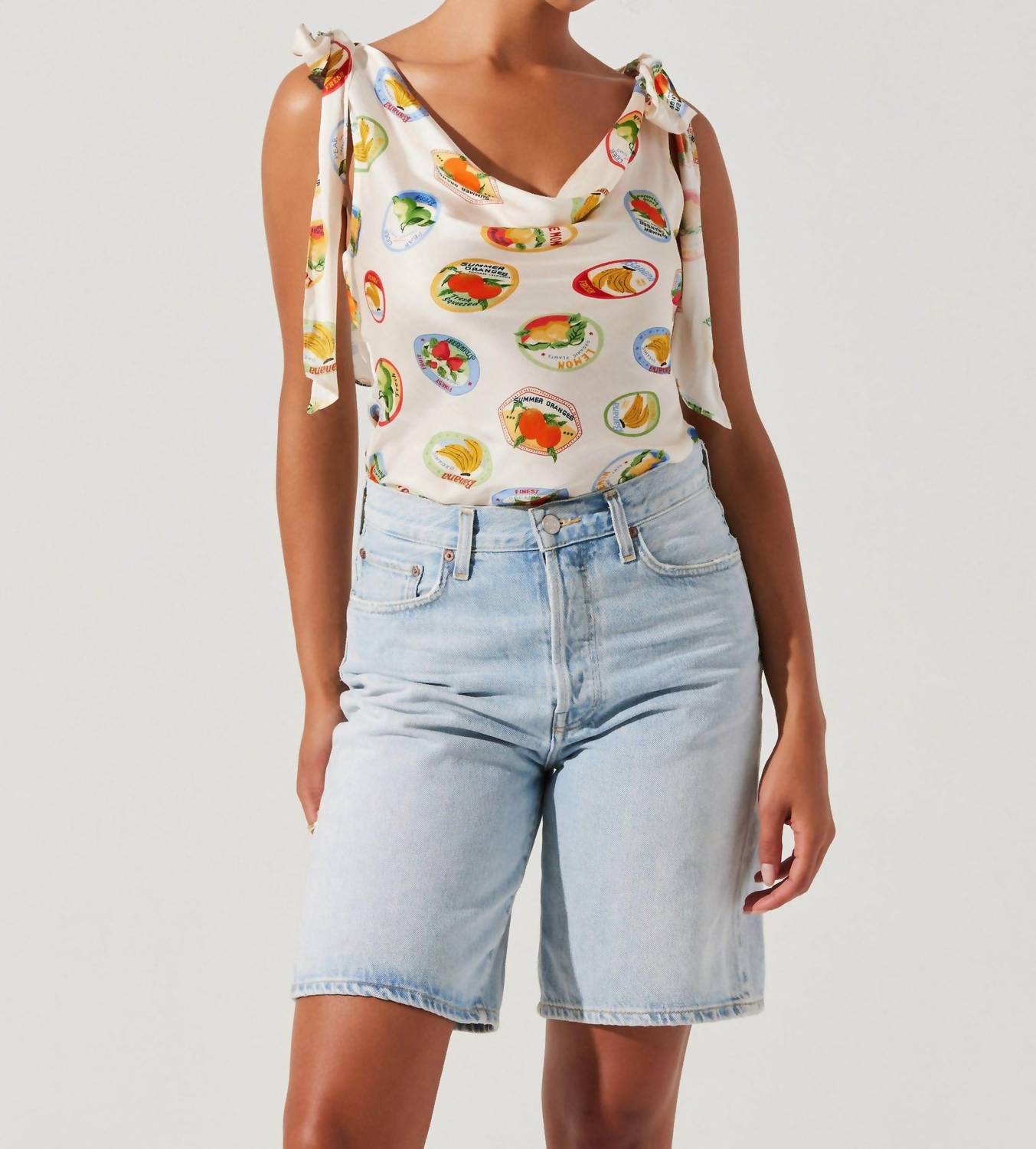 A versatile blouse that works from desk to dinner! Get ready to elevate your wardrobe with the Allexina Satin Tie Shoulder Top by ASTR. This sleeveless blouse in a captivating Ivory Fruit Cocktail hue features a stylish cowl neckline and adjustable self-tie shoulder straps for a perfect fit. Crafted from 100% Viscose, this pullover-style top is designed for those boho chic vacation vibes. Care: Dry clean only. Closure: Tie closure.