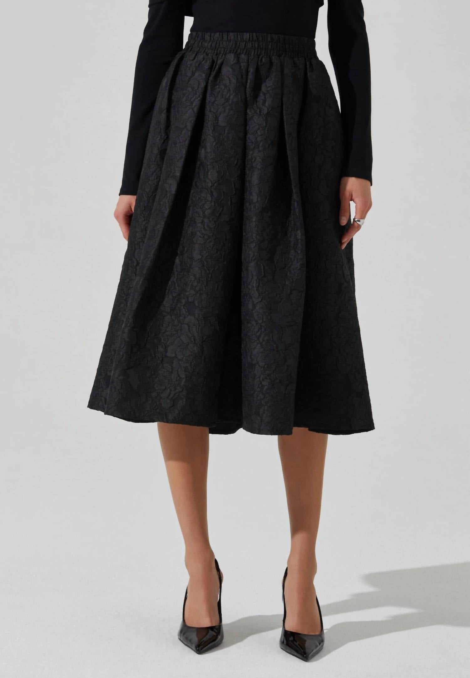 Show off just the right amount of skin in this beautifuly designed midi length skirt. Elevate your wardrobe with the Andolina Jacquard Midi Skirt from ASTR, perfect for sophisticated elegance at any evening event. This stunning piece, in timeless black, showcases a full skirt with slight pleating and features an elasticized waistband for easy pull-on styling. Crafted with 100% polyester, it includes convenient side pockets, making it a trendy choice for Thanksgiving and other special occasions. Ideal for a chic spring look, this skirt embodies the quiet luxury trend. Model is 5'10" and wears a size small.