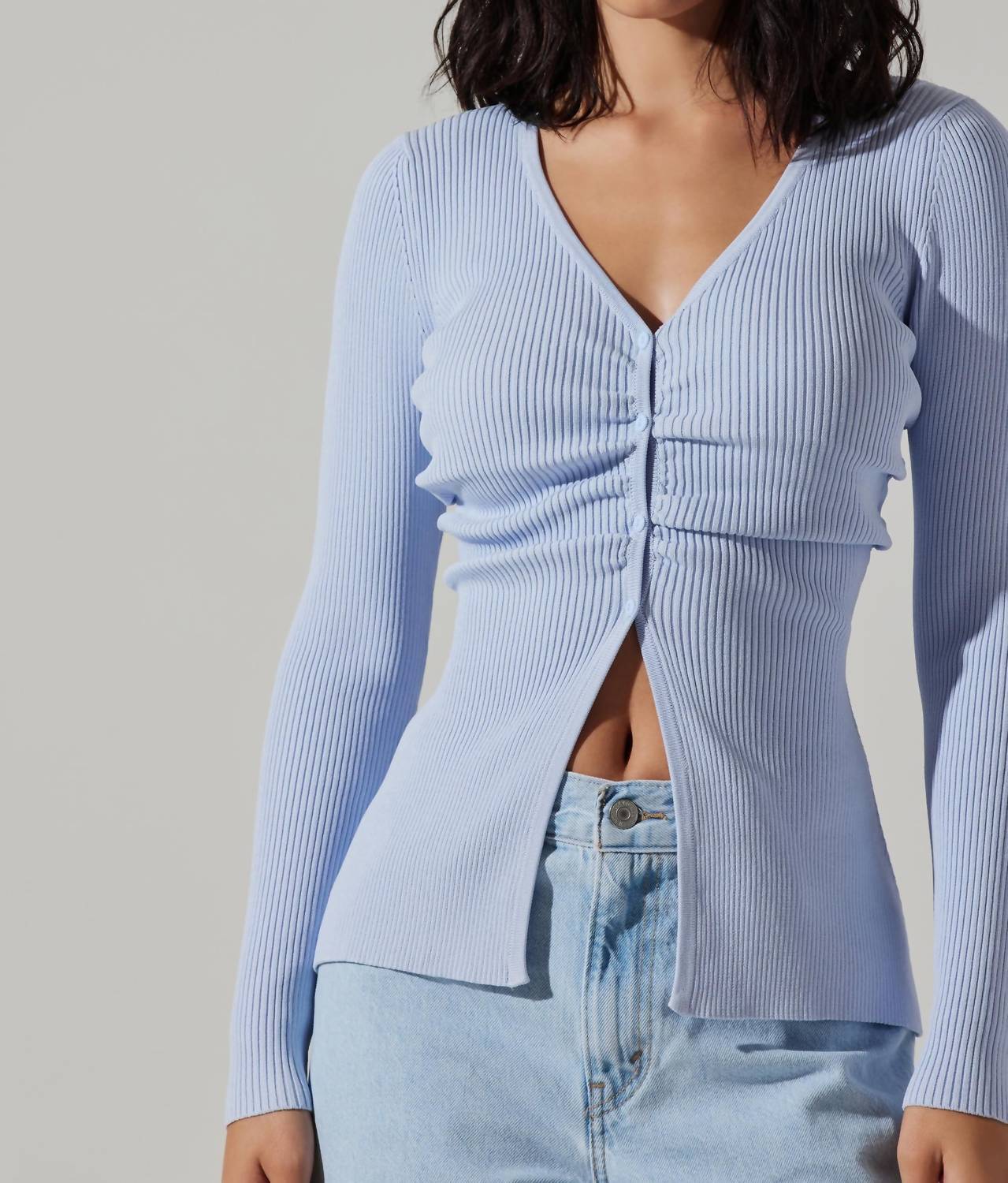 Throw this adorable cardigan over any cami or tank top.V-neckline, ribbed knit finish. Ruched center button placket, long sleeves. Fabric: 56% Viscose, 30% Nylon, 14% Elastane. Dry clean only. Model is 5'8" wearing size S. Measurements on size Small - Length: 23 1/2", Bust: 23".