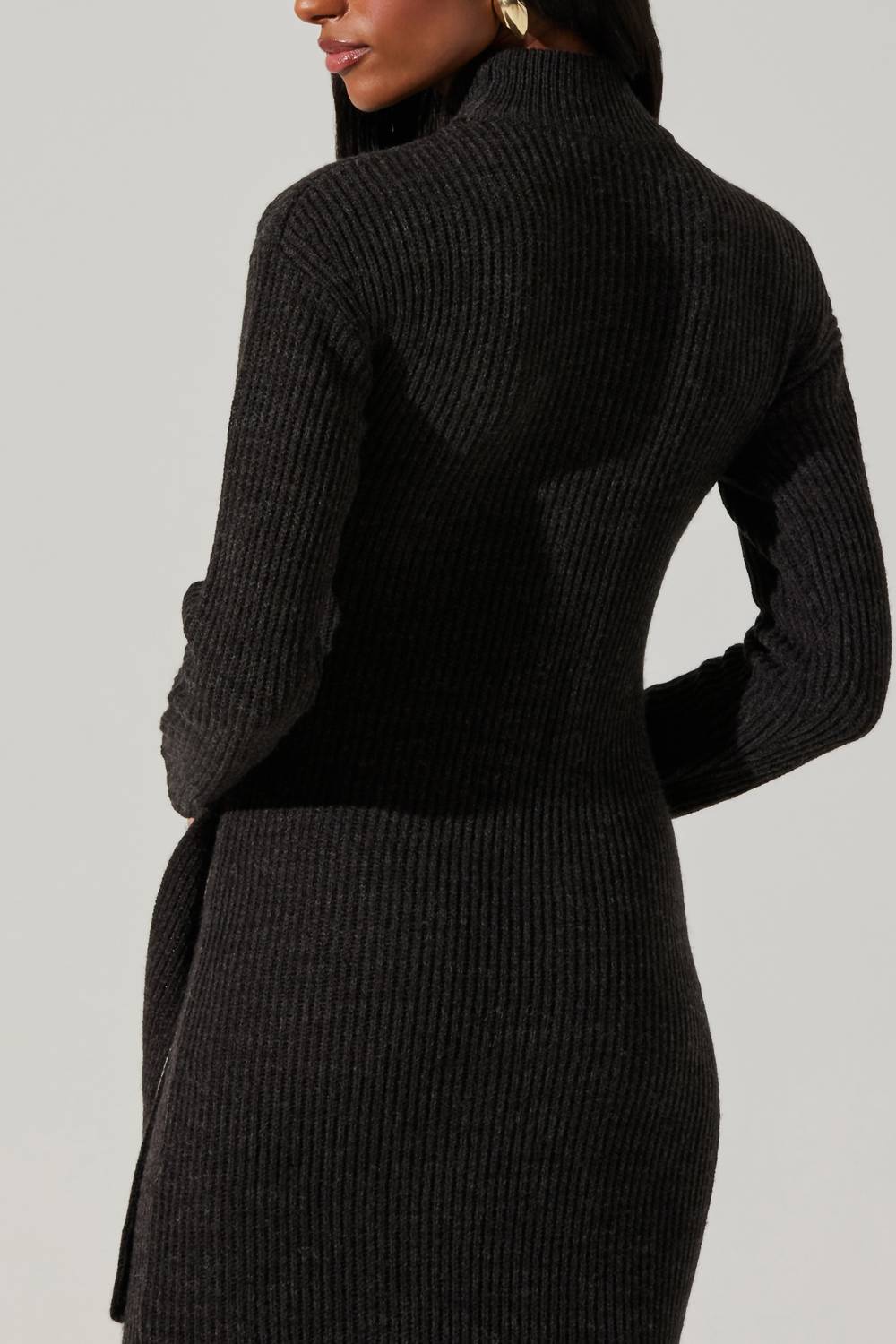 The perfect length dress does exist. Introducing the Audree Midi Sweater Dress by ASTR, a chic addition to your wardrobe crafted for an evening event or Thanksgiving gathering. This dress features long sleeves and a flattering bodycon silhouette with a stylish collarbone cutout and side tie. Composition: 85% Acrylic, 15% Wool. Closure: Pull-on styling. Designed in a sophisticated charcoal hue, it's a solid statement of quiet luxury with a mockneck for the spring season.