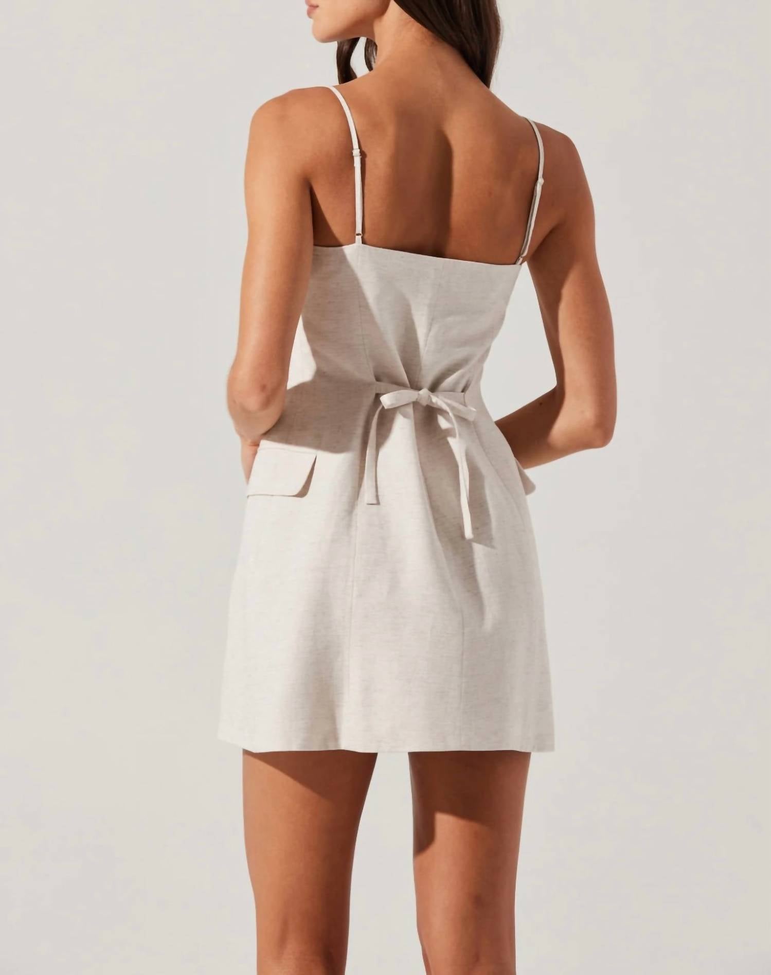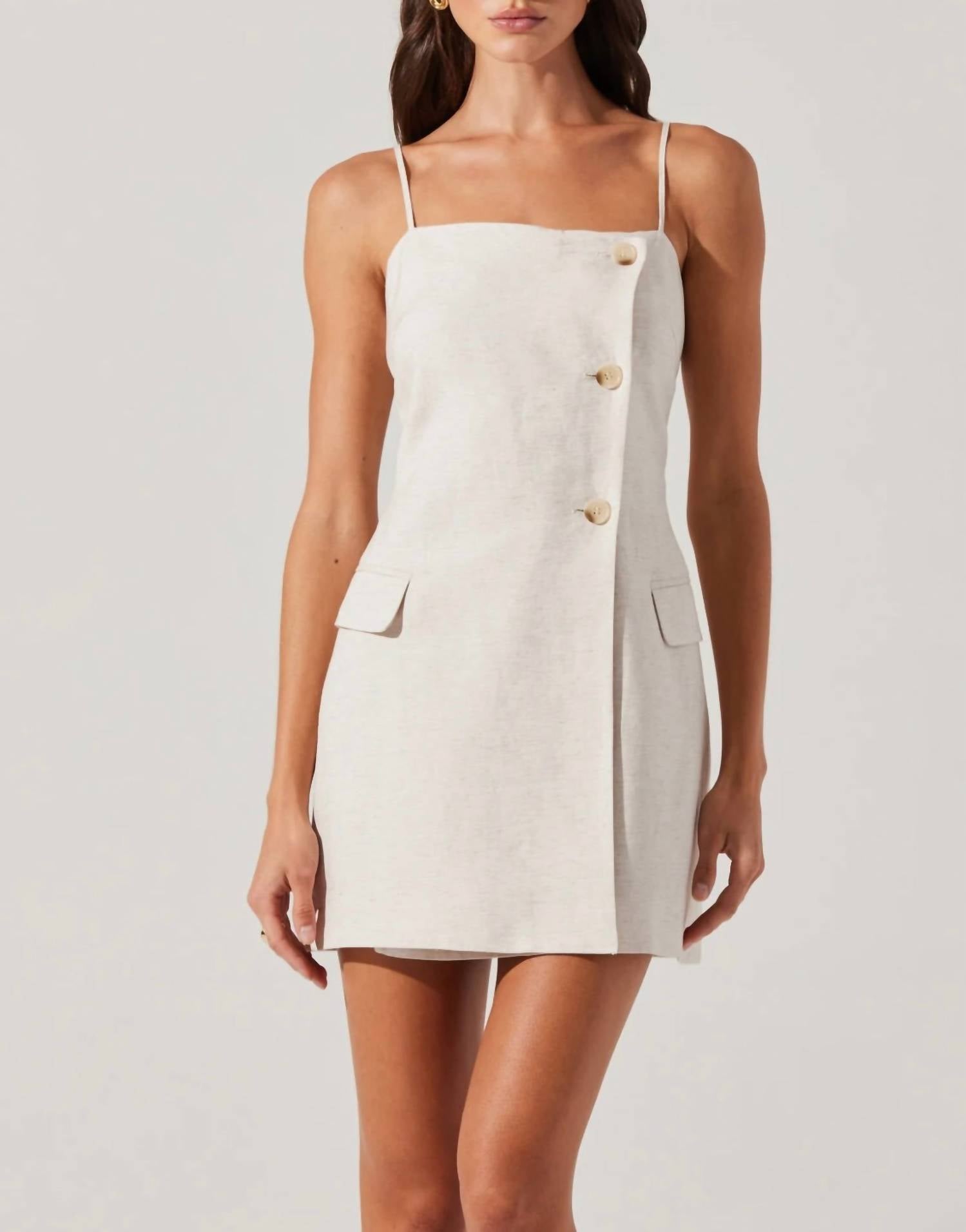 A short and breezy dress for those warmer days. Introducing the Azria Button-Front Wrap Dress by ASTR, an elegant choice for any dinner party or Thanksgiving gathering in oatmeal. This mini dress features sleeveless spaghetti straps with a stylish shift silhouette and a wrap design, complete with a button-front closure and adjustable back ties for a personalized fit. Crafted from a linen blend (55% linen, 45% rayon) and fully lined with 100% cotton, it includes faux front pockets for added flair. Its minimalist design perfectly complements a spring wardrobe, making it an ideal option for a refined, sophisticated look.