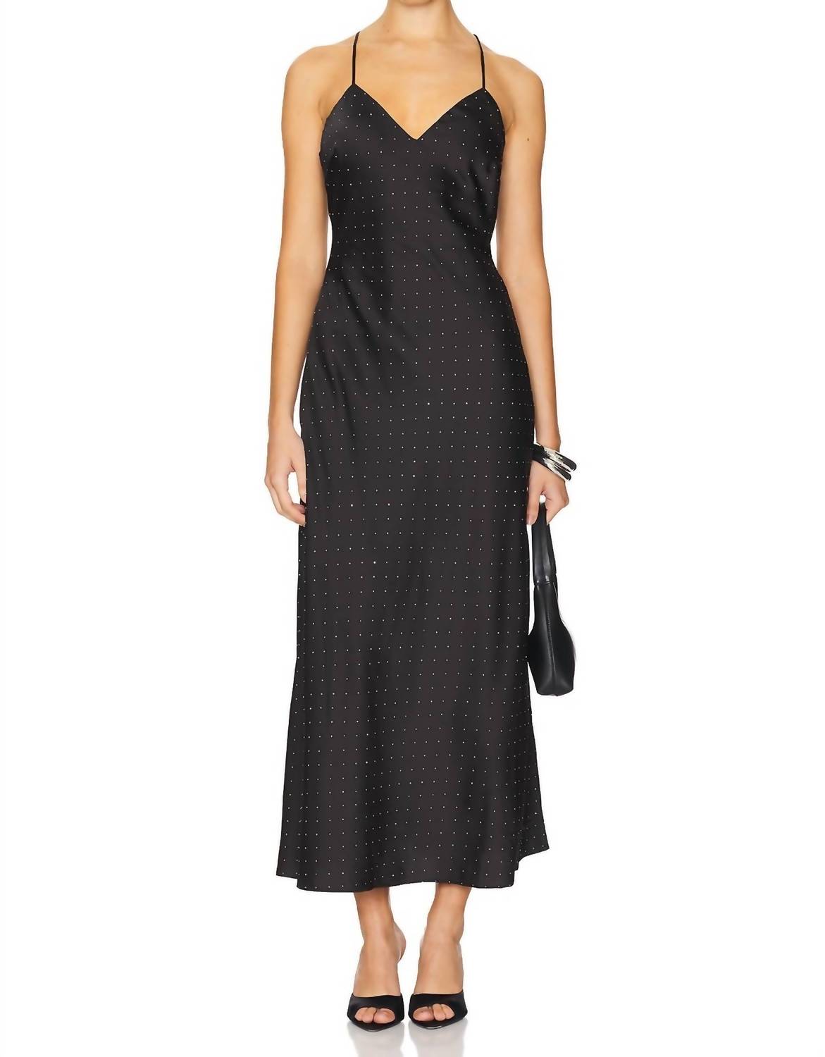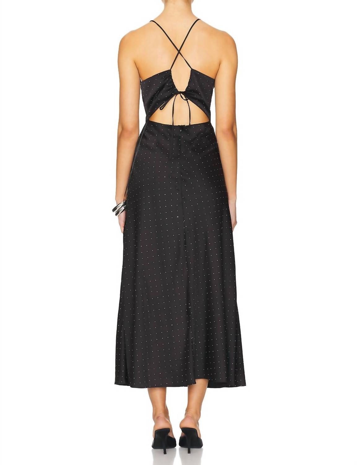 Style this maxi with your favorite statement necklace and sandals for the perfect look. Make a dazzling entrance with the Bonney Dress by ASTR, a stunning V-neck maxi slip dress in classic black. Featuring spaghetti straps and adorned with heat-fixed rhinestones, this dress exudes luxury and elegance. Its adjustable tie cross-back straps, back cutout, and concealed zip closure make for a perfect fit and sophisticated silhouette. Crafted from a blend of 95% polyester and 5% elastane, with a fully lined interior, this dress measures 53.5 inches in length and requires dry cleaning to maintain its exquisite appearance.