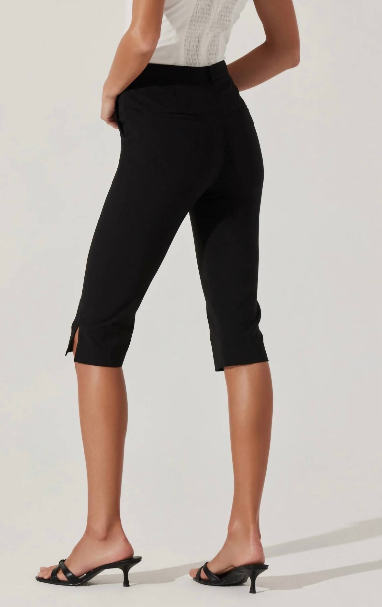The perfect capri pants for those transitional seasons. Pair them with booties or flats! Introducing the Cardin Slim Fit Capri Pants by ASTR, a chic and versatile choice for any occasion. These women's capris in a solid black design are crafted from a blend of 65% rayon, 30% nylon, and 5% elastane, with pockets made from 100% rayon. Featuring a slim fit with functional belt loops and side pockets, these capris are finished with side slits at the calves and a concealed front zipper with a hook closure. For easy care, these pants are machine washable and can be tumble dried.