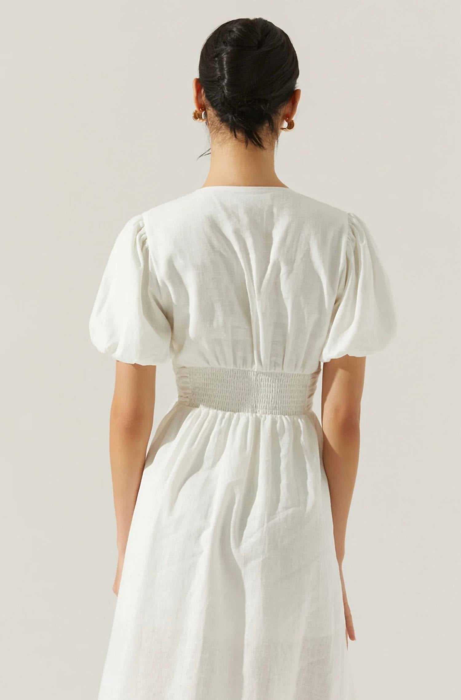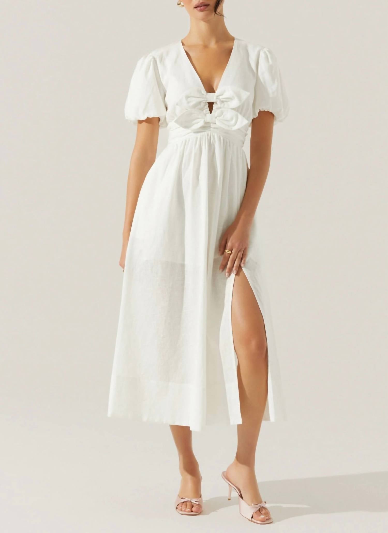 The perfect length dress does exist. Introducing the Citrine Linen Bow Front Midi Dress by ASTR, a sophisticated addition to your summer wardrobe. This dress features short puff sleeves and a V-neckline, beautifully designed with a gathering at the mid-torso and a smocked back for a tailored fit. Crafted from a high-quality linen blend (55% linen, 45% cotton) with a 100% rayon lining that stops at the slit, it comes in elegant white, perfect for any dinner party or festive occasion. Closure is secured with a concealed side zipper, and it includes two practical side pockets.