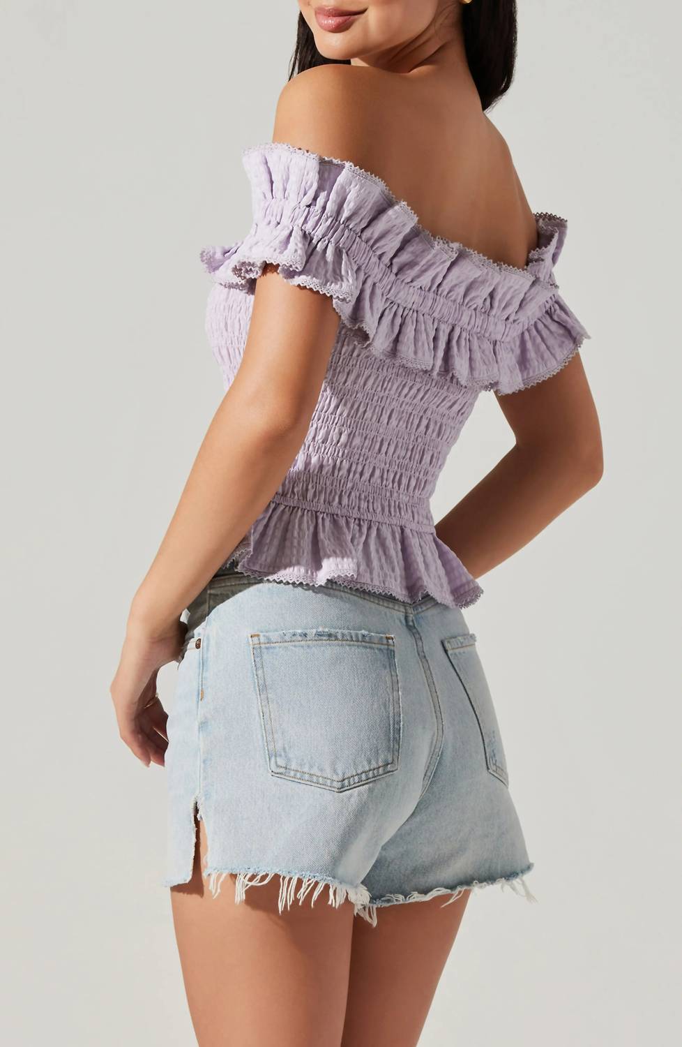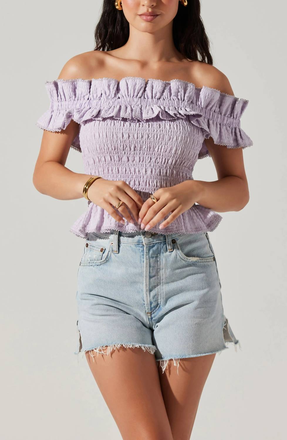 This classic, short sleeve tee will be your go-to staple this season and beyond. Discover the charming allure of the ASTR Foufette Top in a delicate lilac hue. Featuring a strapless, off-the-shoulder neckline, this textured top is accented with frothy ruffles and short sleeves, crafted from 100% polyester. It offers an elegant touch with its allover smocking detail and is imported with a perfect finish. For best results, dry clean only to maintain its exquisite form.