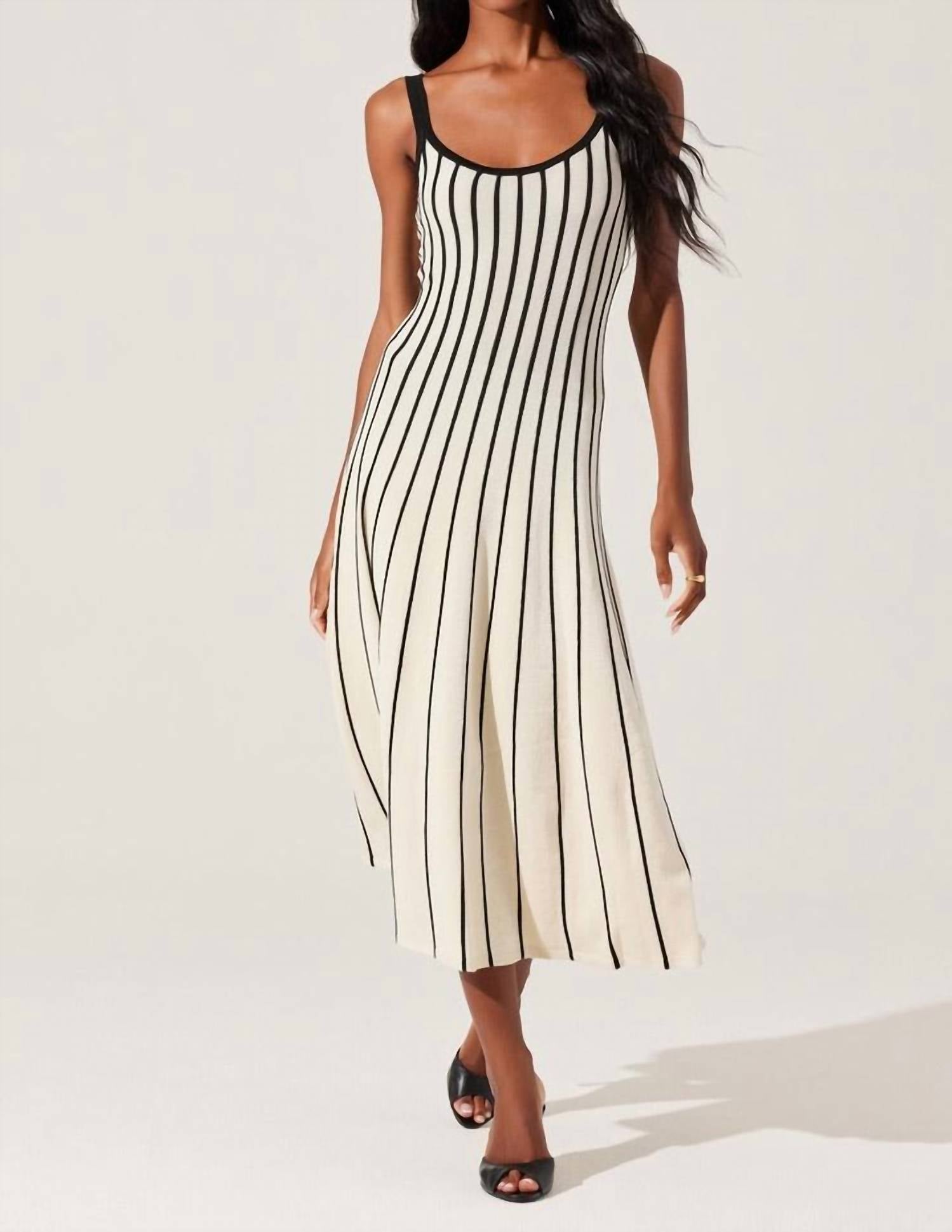 Elevate your dinner party look with the Irecia Stripe Sweater Midi Dress by ASTR. This sleek, sleeveless tank knit dress features a scoop neckline and a pullover style for easy wear. Made from 100% Rayon, it's designed in a classic A-line silhouette with a length of 45 inches, bust of 22 inches, and waist of 24 inches. Care instructions suggest machine washing for easy maintenance. Perfectly suited for occasions like the 4th of July or any spring gathering, the model wears a size XS and stands 5'9".