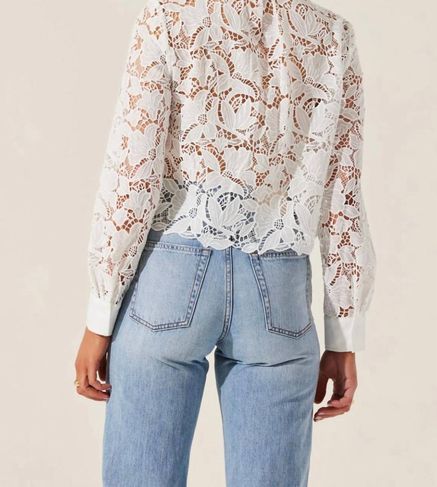 A long sleeve top you can wear with denim, skirts, well... just about anything! Elevate your wardrobe with the Isabis Floral Lace Top by ASTR, an embodiment of sophistication in white. This boho chic piece boasts long sleeves and features a harmonious blend of polyester for the self and cotton for the contrast collar, enhancing its elegant appeal. The intentional transparency of the intricate lace pattern delivers a textured look, while the cropped length and button-front closure, including button closures at the sleeves, infuse a modern edge. This collar-neckline top is perfect for a versatile summer wardrobe or Thanksgiving occasion, making it an essential for a vacation-ready style.