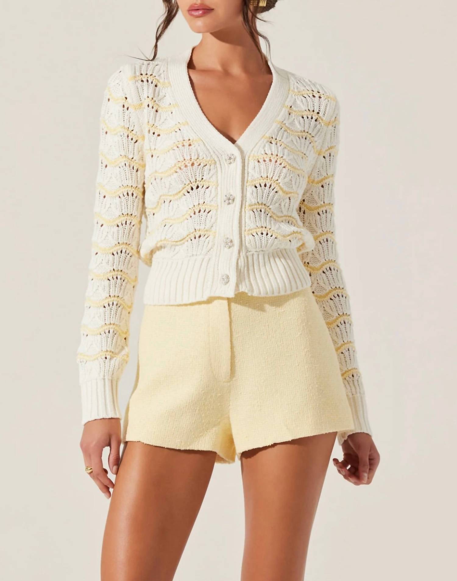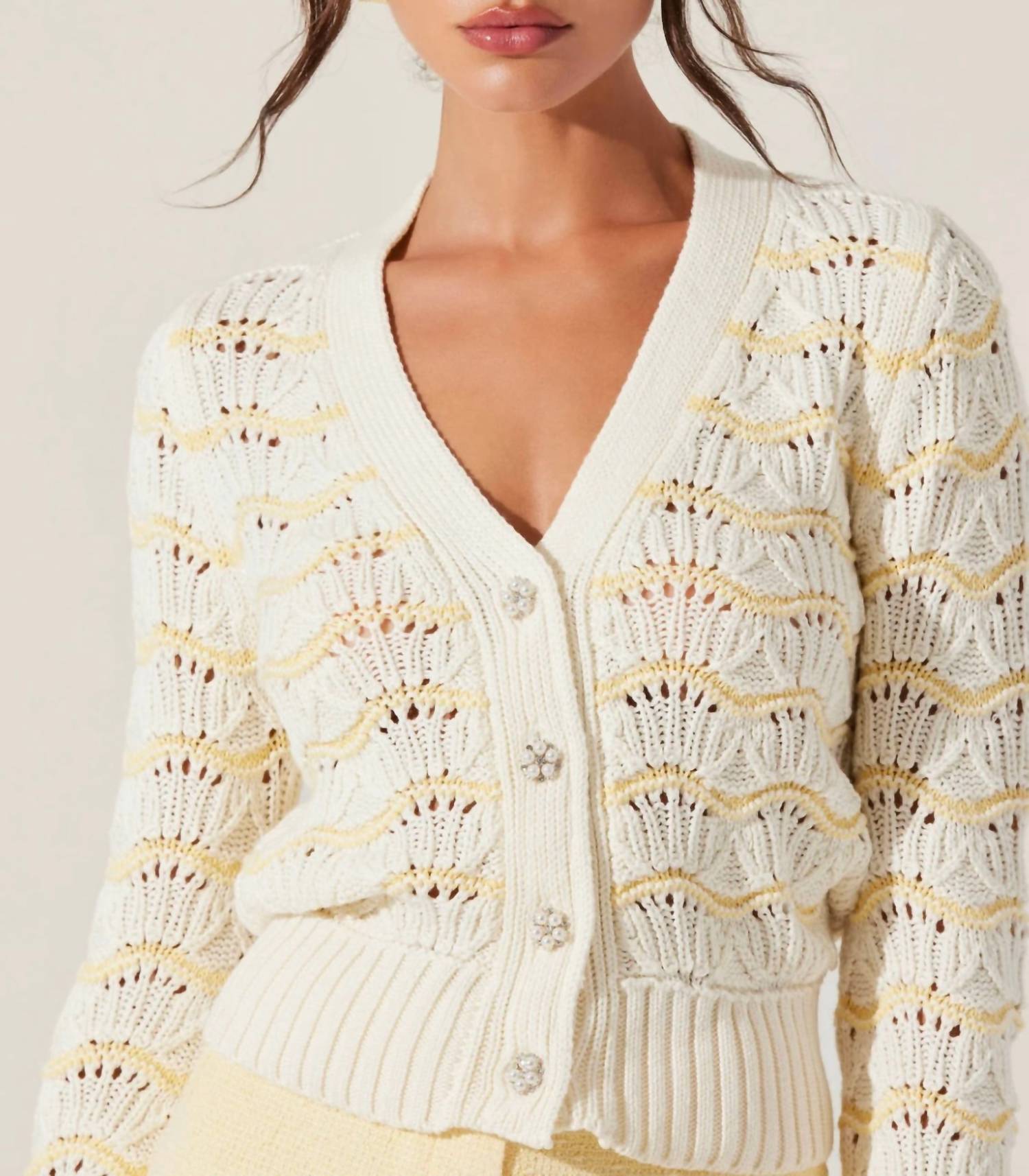 Throw this adorable cardigan over any cami or tank top. Presenting the Janira Wavy Stripe Pointelle Cardigan by ASTR, an exquisite choice for your dinner party ensemble. This cardigan features long sleeves and a sophisticated scoop neckline, detailed with a wavy stripe pointelle design. Crafted from 55% acrylic and 45% cotton, it includes a full button-front closure adorned with delicate pearl buttons. For best results, dry clean only.