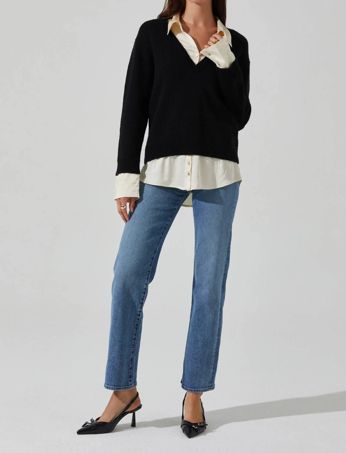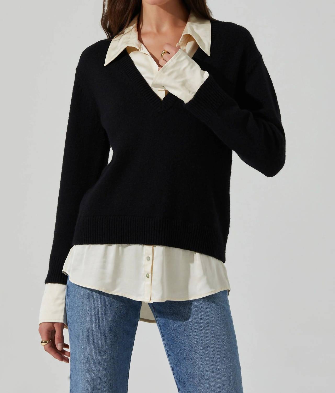 Wear this v-neck sweater with your favorite denim for the perfect fall look. Elevate your wardrobe with the Jianna Mixed Media Layered Sweater from ASTR, perfect for achieving a chic "shirt layered look" without the fuss. Crafted for women, this black V-neck sweater features long sleeves and is made from a luxurious mix of nylon, wool, and acrylic, with a satin undershirt composed of cotton and rayon. Designed in a solid pattern with decorative buttons on the shirt and sleeve cuffs, this pull-on sweater encapsulates sophisticated winter workwear style. Care: Dry clean only.