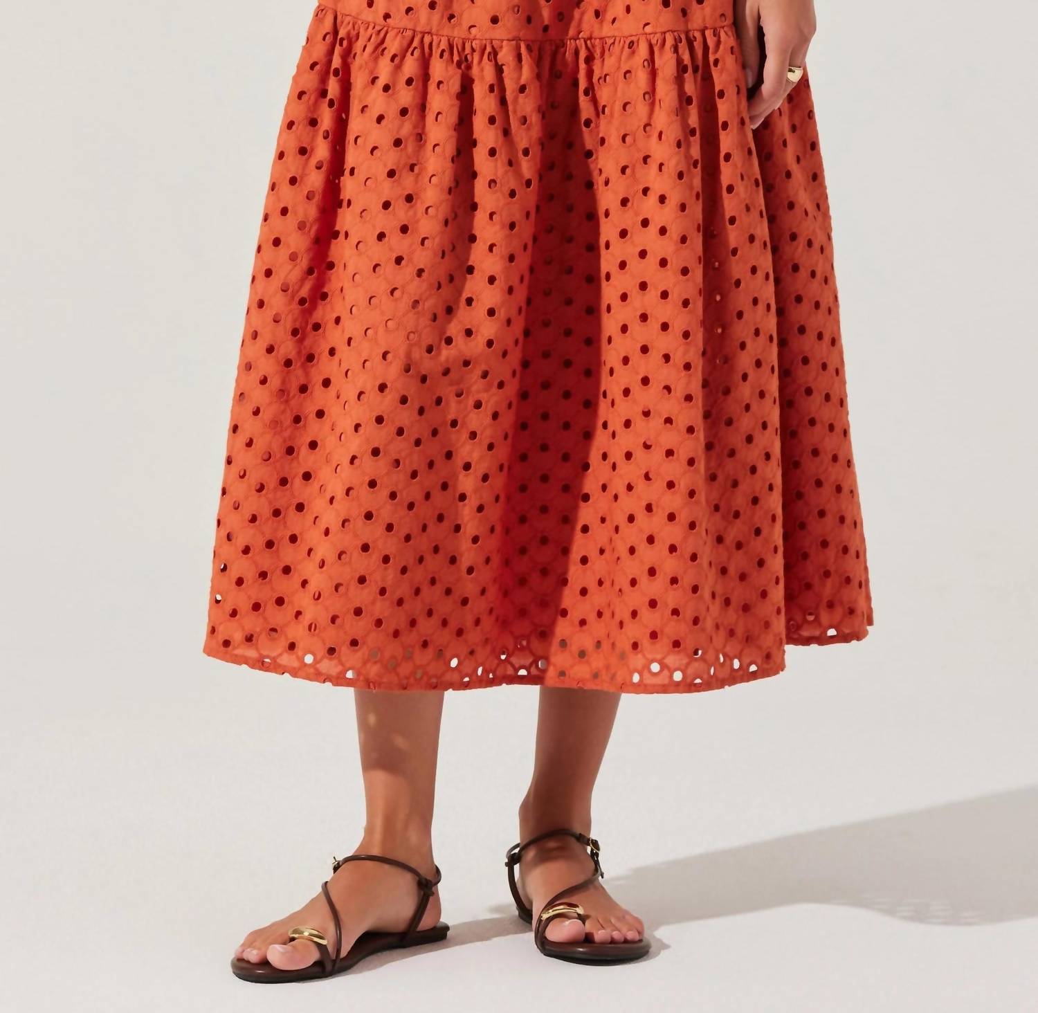The Nalley Midi Skirt by ASTR the Label offers a breezy, boho-chic style with its textured, rust-orange eyelet cotton fabric. Featuring a tiered design with an elastic waistband for a comfortable pull-on fit, this midi skirt is perfect for summer beach days or a Fourth of July celebration. Convenient pockets add practicality to its feminine silhouette. Made from 100% Cotton, it is an imported piece that requires dry cleaning. Model Addy Grace, standing at 5ft 9 inches with a 32” bust, 27” waist, and 34” hips, is wearing an x-small, showcasing its true-to-size fit.