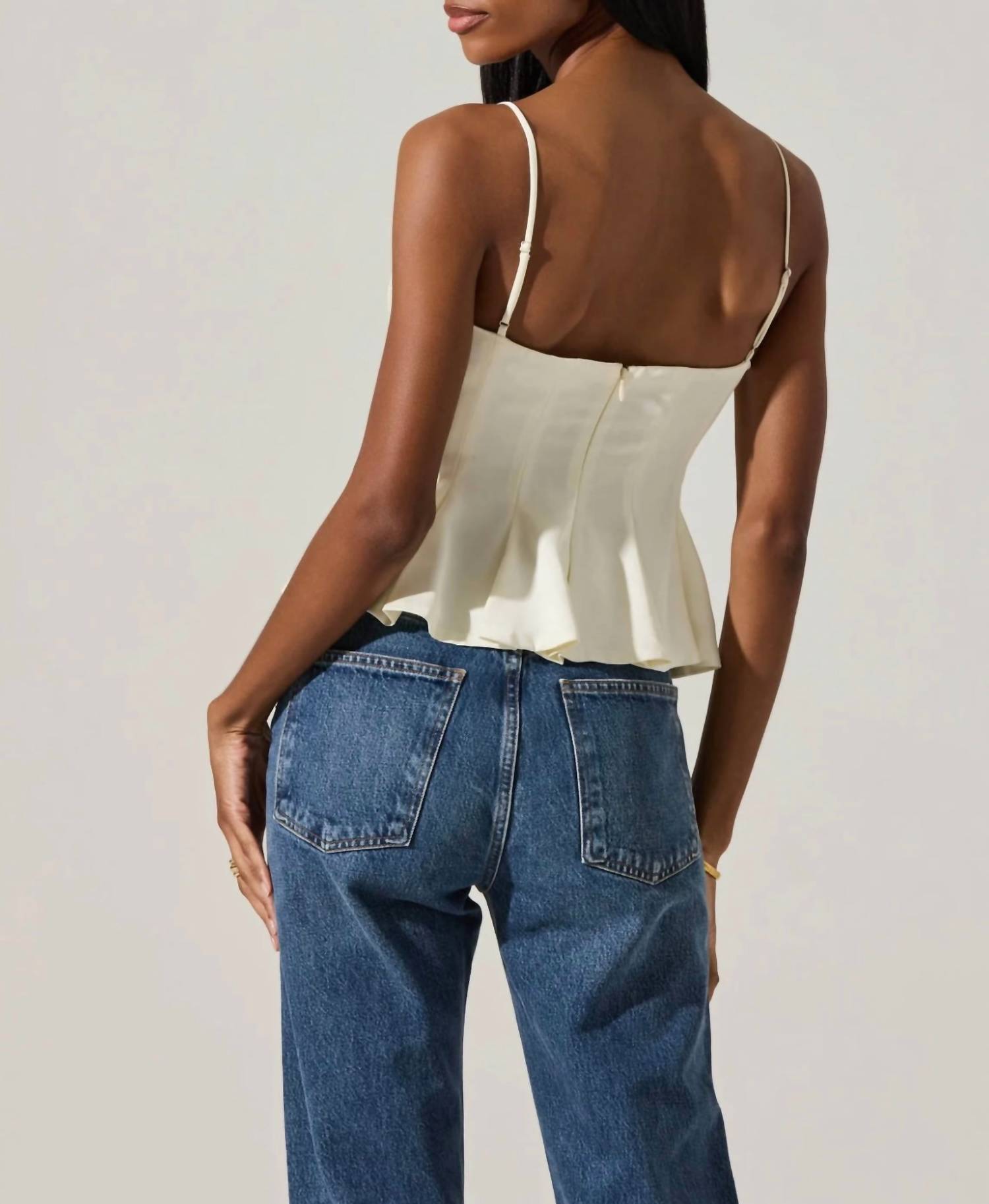 Introducing the Paislee Satin Pleated Peplum Top by ASTR, an exquisite choice for your evening events. This sleeveless top, in a sophisticated cream hue, features a flattering V-neckline and adjustable spaghetti straps. Crafted from 100% polyester, it includes a concealed back zipper closure for a seamless look. Care for this elegant piece with a hand wash and line dry to maintain its delicate charm.