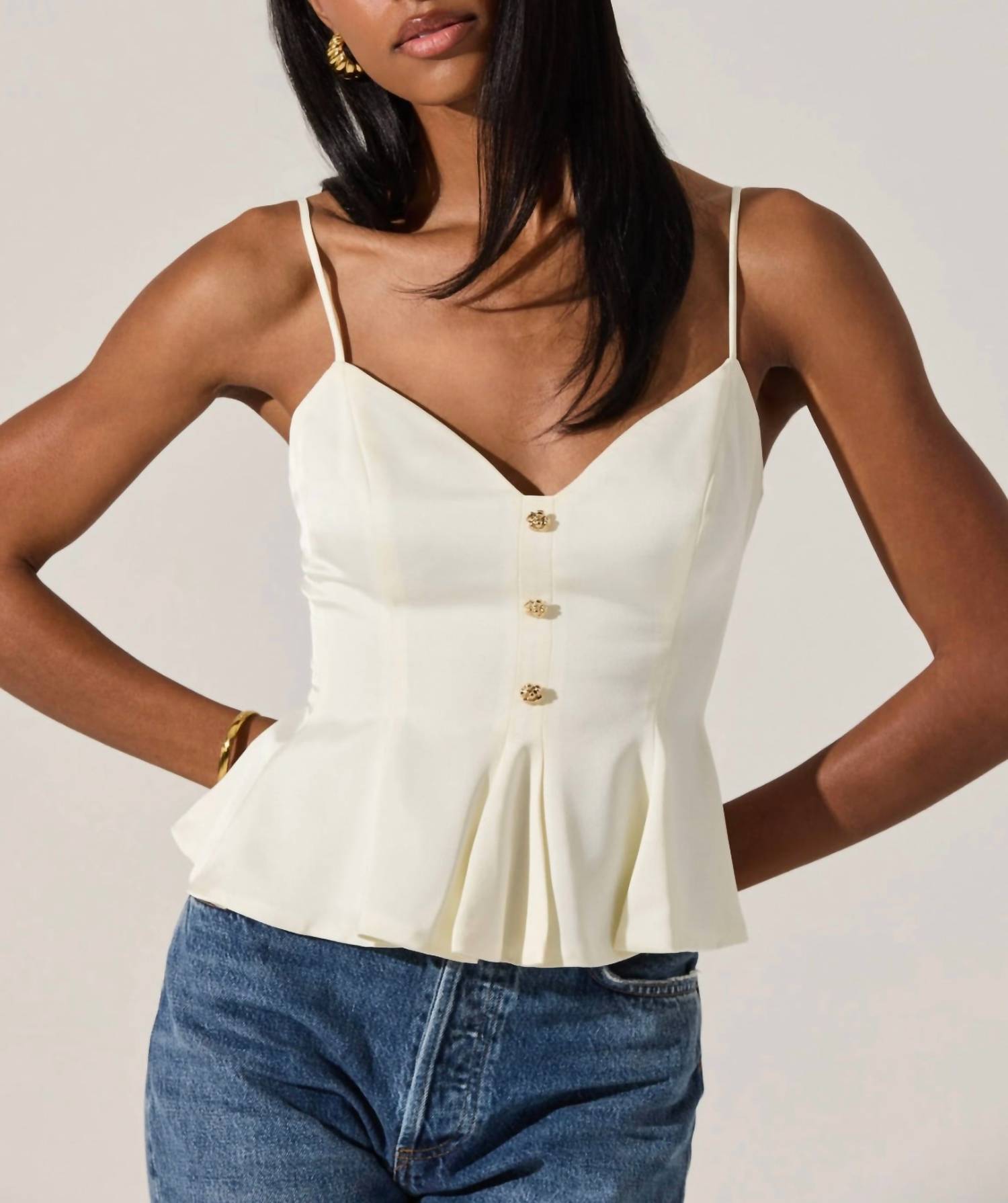 A versatile blouse that works from desk to dinner! Introducing the Paislee Satin Pleated Peplum Top by ASTR, an exquisite choice for your evening events. This sleeveless top, in a sophisticated cream hue, features a flattering V-neckline and adjustable spaghetti straps. Crafted from 100% polyester, it includes a concealed back zipper closure for a seamless look. Care for this elegant piece with a hand wash and line dry to maintain its delicate charm.