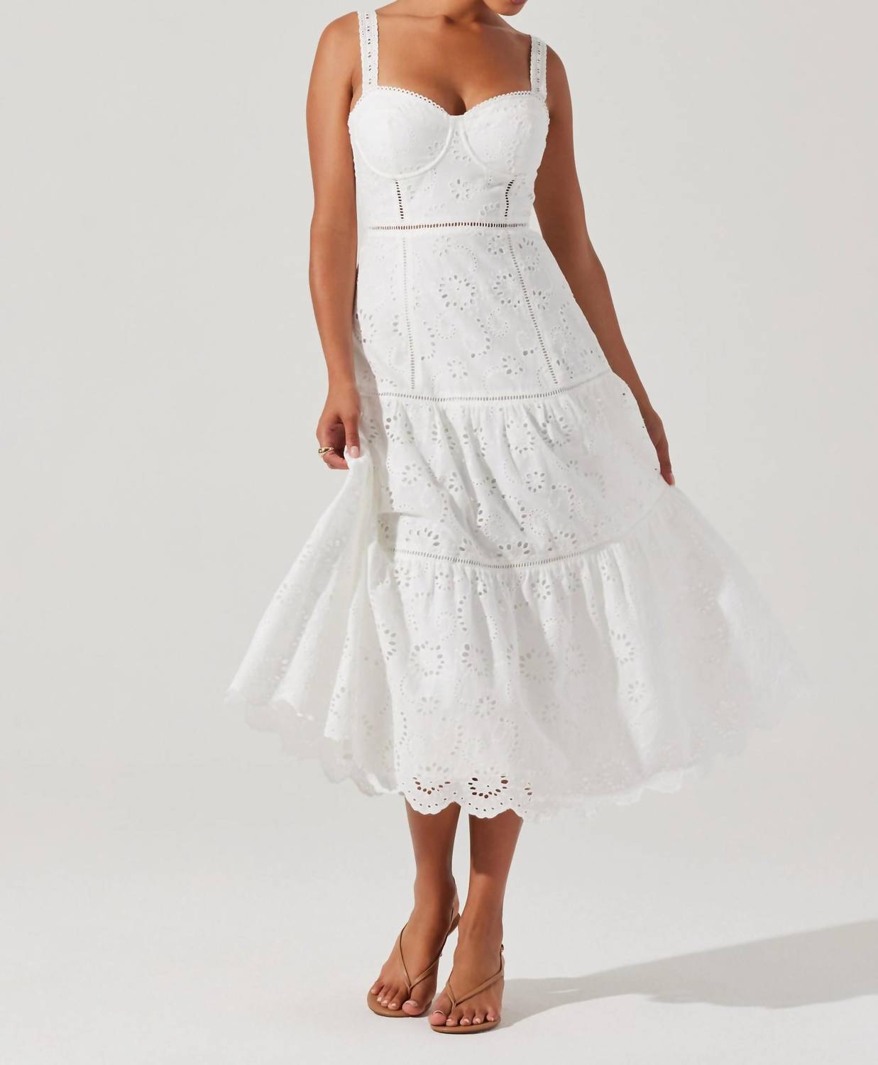 Introducing the Pellagia Eyelet Midi Dress by ASTR, a stunning piece for special occasions. This fit and flare dress is sleeveless with adjustable lace button straps and a sweetheart neckline, perfect for spring weddings or holiday celebrations. Made from a cotton blend with 100% cotton self and 100% rayon lining, it features a smocked back and a tiered skirt with scalloped trims. Closure: Concealed zip closure. Care: Dry clean only.