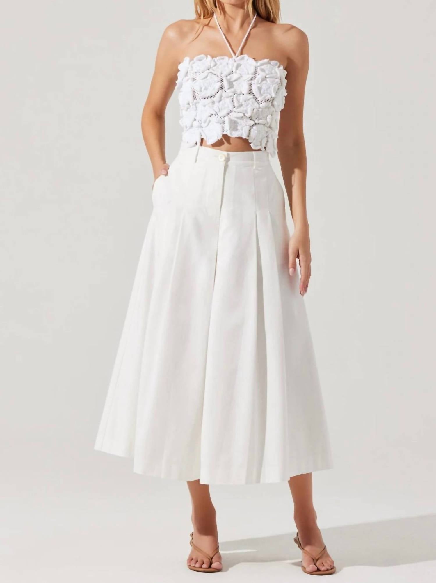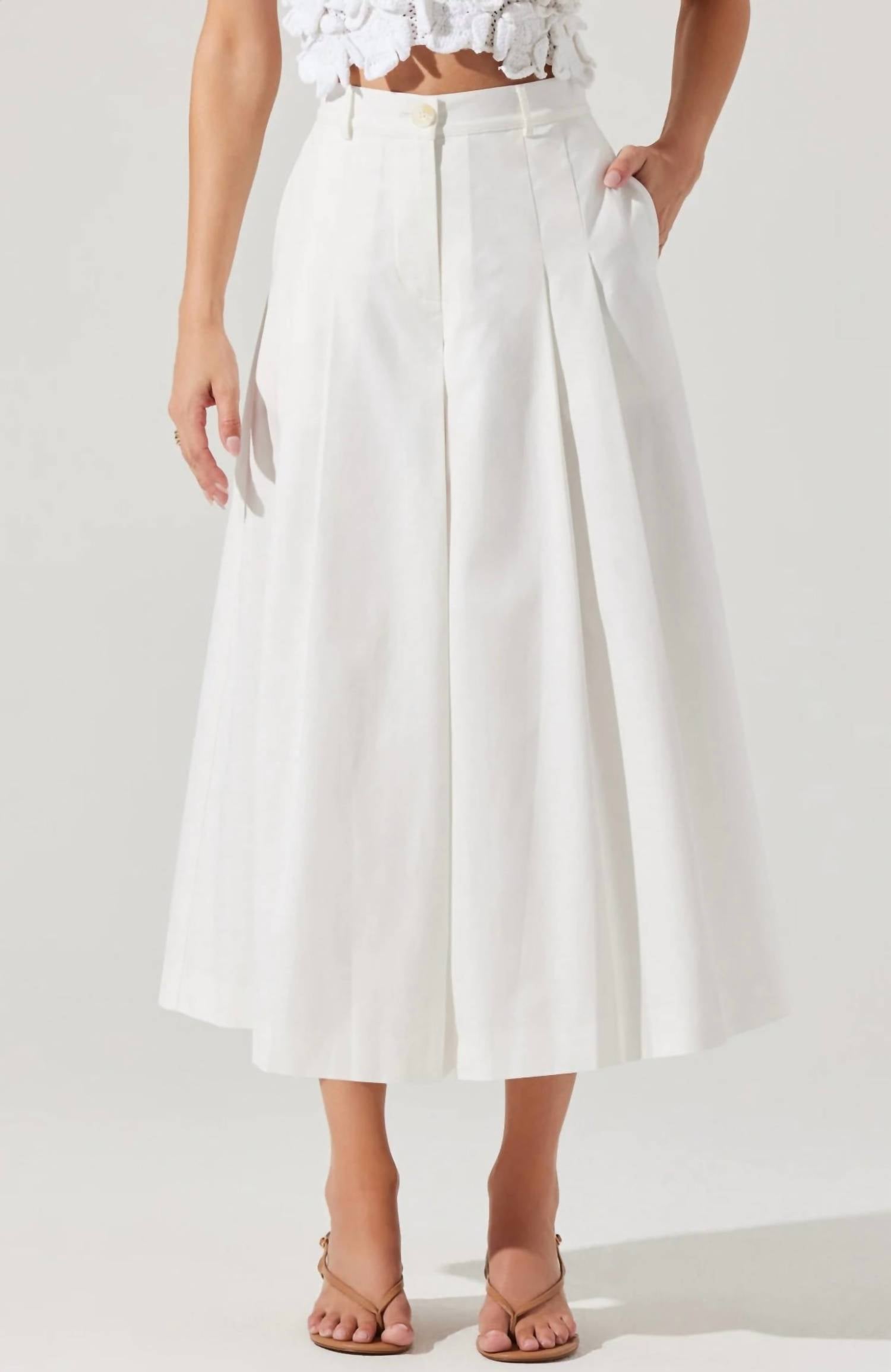 Introducing the Rowen Pleated Culotte Pants by ASTR, a sophisticated choice for any wardrobe. These wide-leg pants, crafted from 100% cotton, feature a concealed center front zipper with button closure and functional side pockets, combined with a decorative back welt pocket for added flair. The white, solid pattern and delicate pleats provide a tasteful look, perfect for summer occasions like a Thanksgiving dinner party. Care instructions include machine washing for convenience.