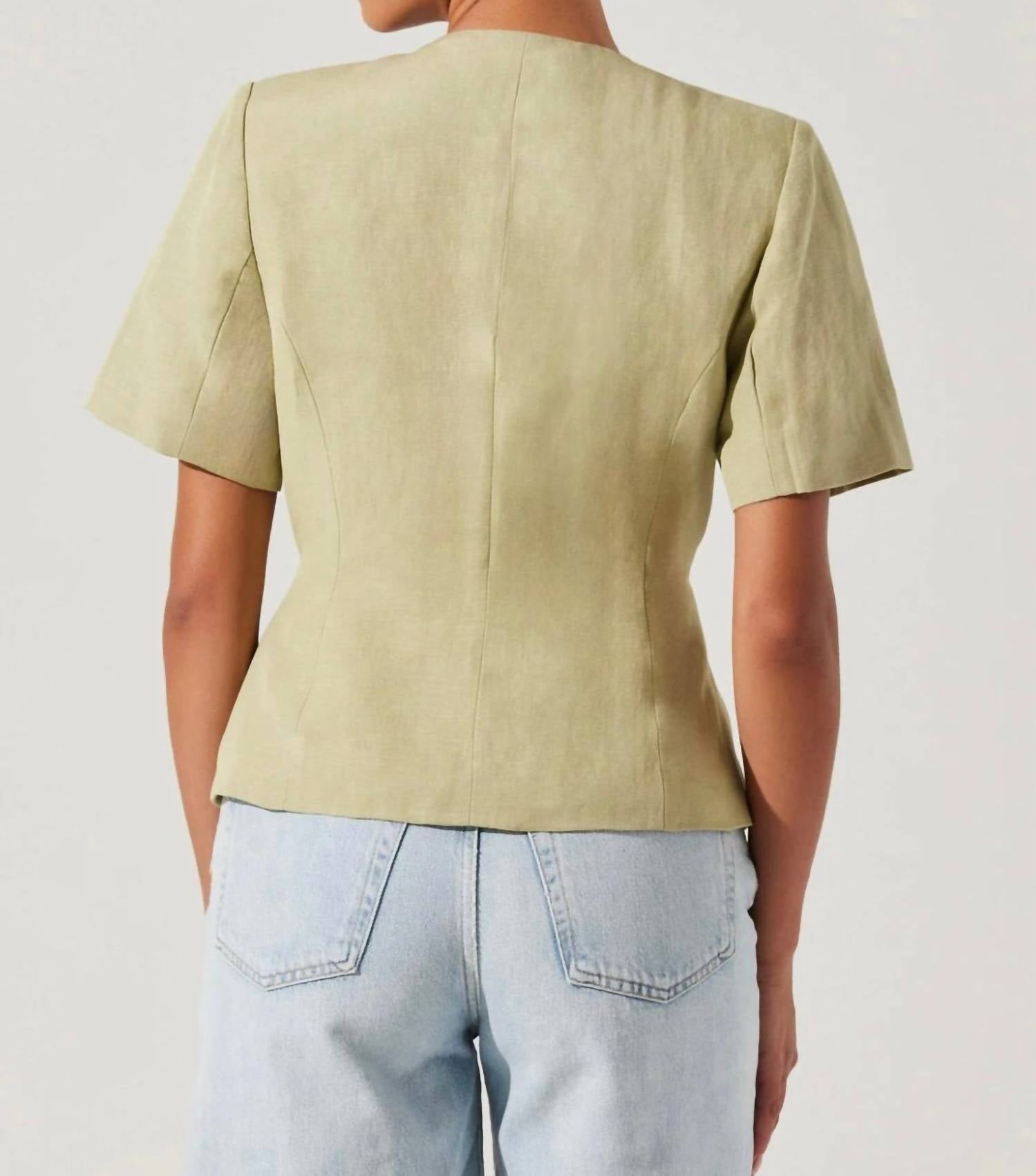 A jacket so versatile you can literally wear it with anything. Introducing the Saige Cutaway Linen Blend Jacket by ASTR, a stylish addition to your summer wardrobe. This jacket features short sleeves and a crewneck, highlighted by a distinctive front button closure with novelty buttons. Crafted from 55% linen and 45% Tencel with a 100% cotton lining, it offers both comfort and sophistication. Perfect for a preppy look at a dinner party or Thanksgiving occasion.