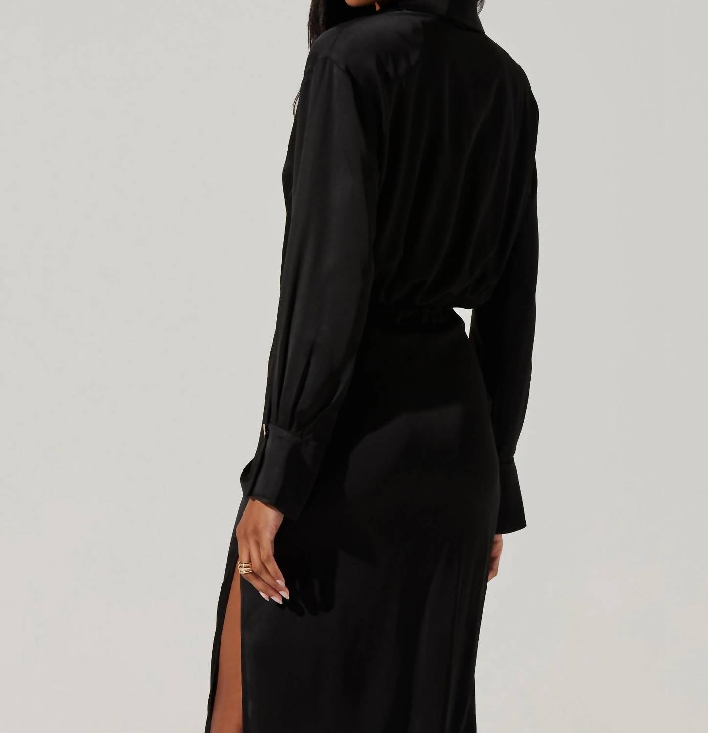 A midi dress so versatile, your options for wearing it are endless. Introducing the Satin Shirt Dress by ASTR, a black midi piece designed for elegance and sophistication. This dress features long sleeves and structured shoulder pads, enhancing its polished silhouette. Crafted from 100% Viscose, it boasts a button closure with an additional discreet side zipper for convenience. Care: Dry clean only.