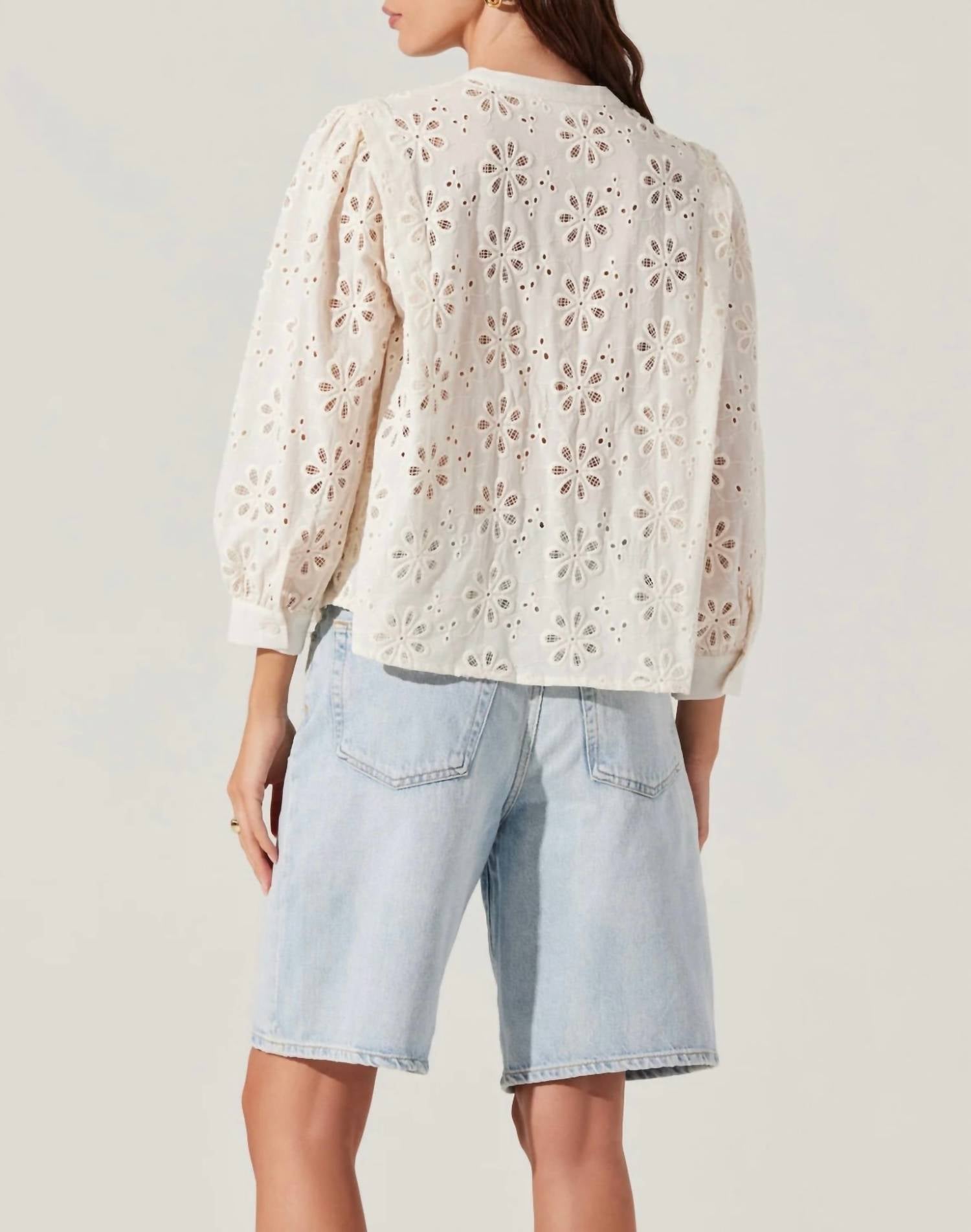 A versatile blouse that works from desk to dinner! Discover the Savanna Eyelet Button Up Top by ASTR, a captivating addition to your wardrobe in a versatile cream shade. Designed with three-quarter sleeves and crafted from 100% cotton, this blouse offers a breathable, comfortable fit. Featuring a front button closure, it boasts a collarless, rounded V-neckline and contrasting details for a refined, minimalist style. Care for this piece is easy with machine wash and tumble dry instructions, making it perfect for season-spanning occasions like summer vacations or Thanksgiving gatherings.