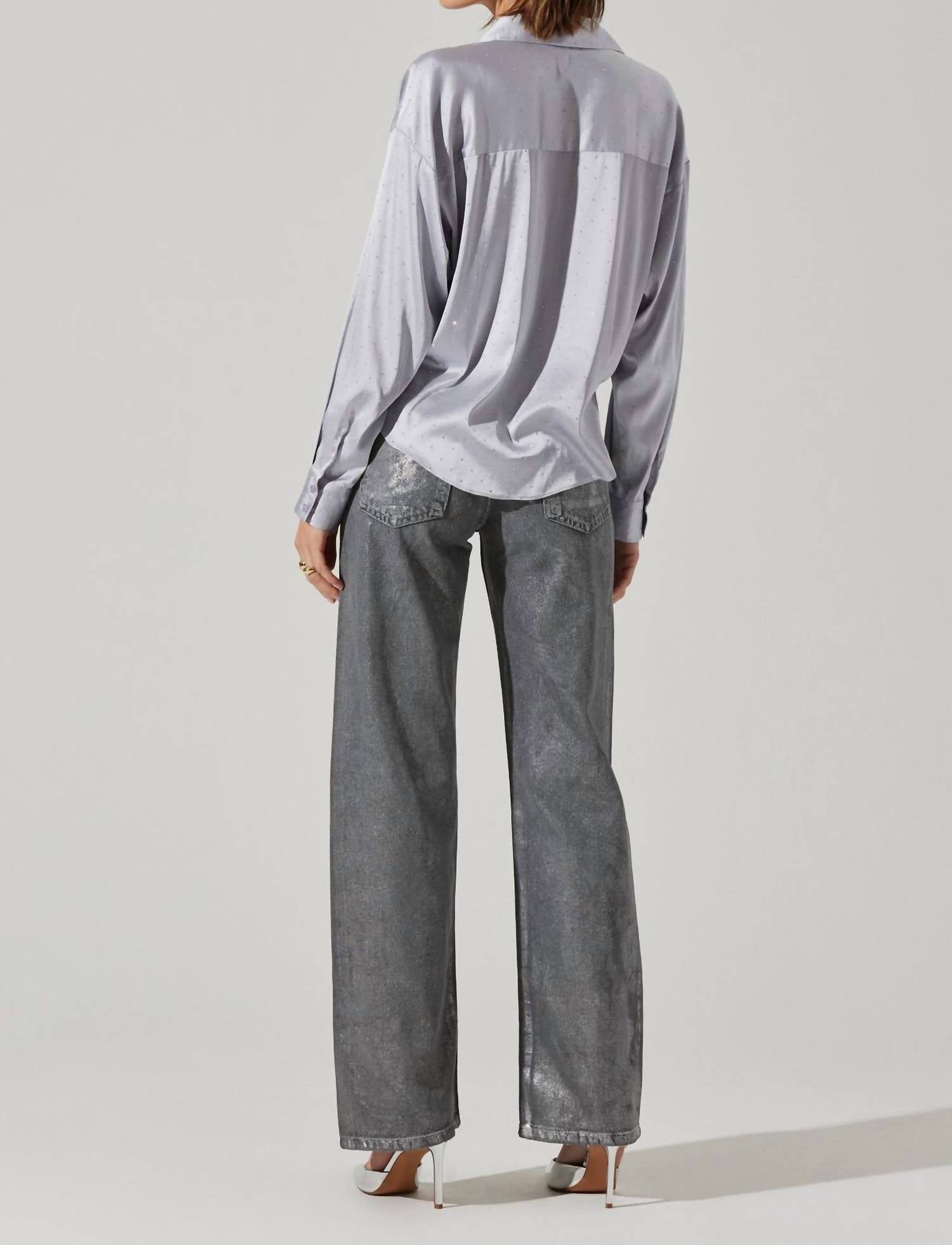 A versatile blouse that works from desk to dinner! Elevate your dinner party style with the Sebio Satin Rhinestone Blouse by ASTR, an embodiment of quiet luxury in striking silver. This long sleeve blouse features heat-fixed rhinestones for a textured finish and a sophisticated gathered twist detail at the hemline. Made from 97% polyester and 3% elastane, this blouse secures with a classic button closure. Care: Dry clean only. The model is 5'10" and is wearing size S.
