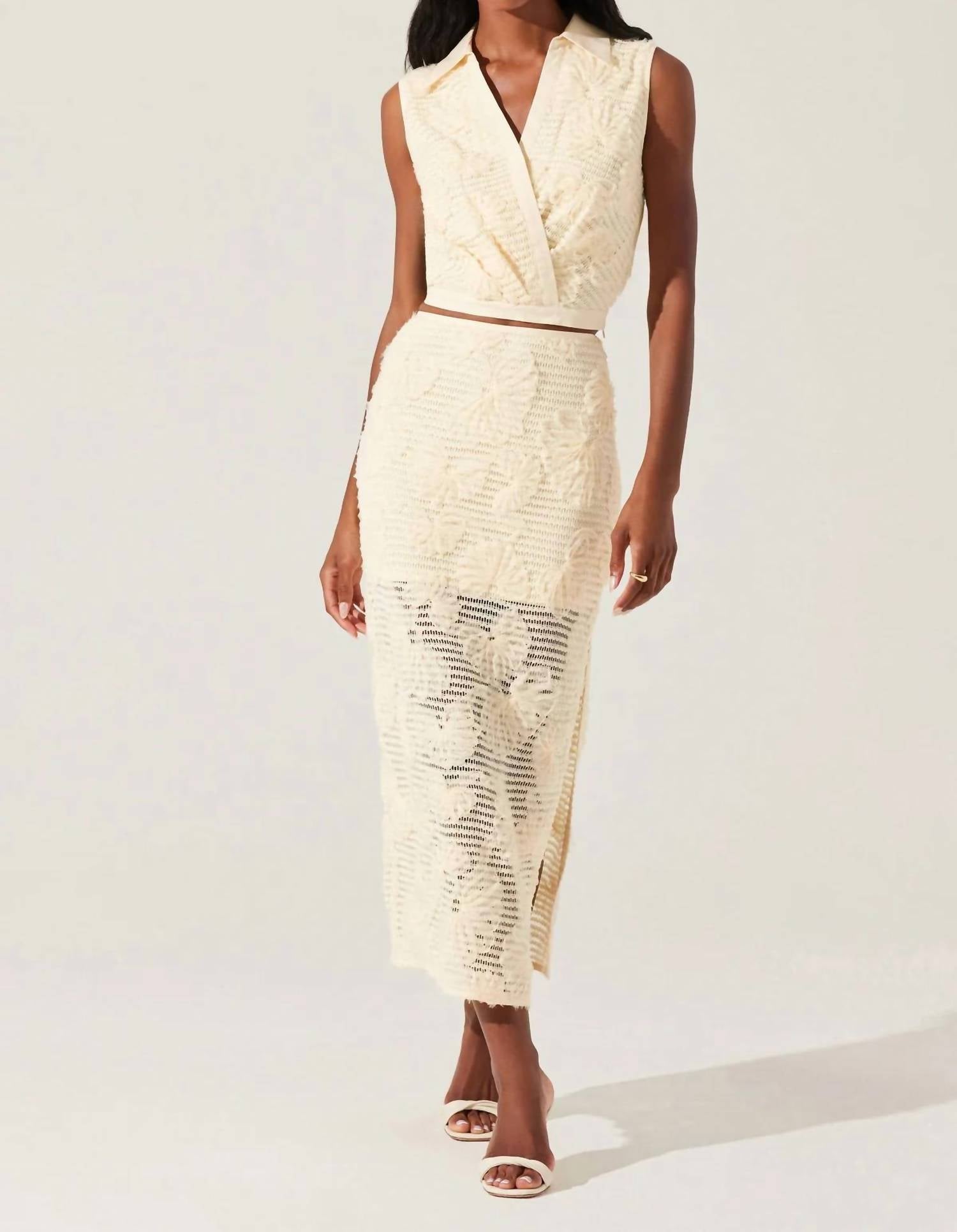 The midi length skirt is here to stay and we especially love this style. Stunning piece perfect for fall occasions. Cream skirt features an open knit floral design with a partially lined interior ending at mid-thigh for a chic layered look. Crafted from a blend of 100% Polyester with 100% Cotton contrast and a Rayon-Elastane lining. Offers both style and comfort. Concealed side zipper ensures a seamless fit. Dry clean-only care maintains its sophisticated appearance. Length measures 33". Waist: 27 1/4". Hips: 32 1/2". Model is wearing size XS (5'9" height).