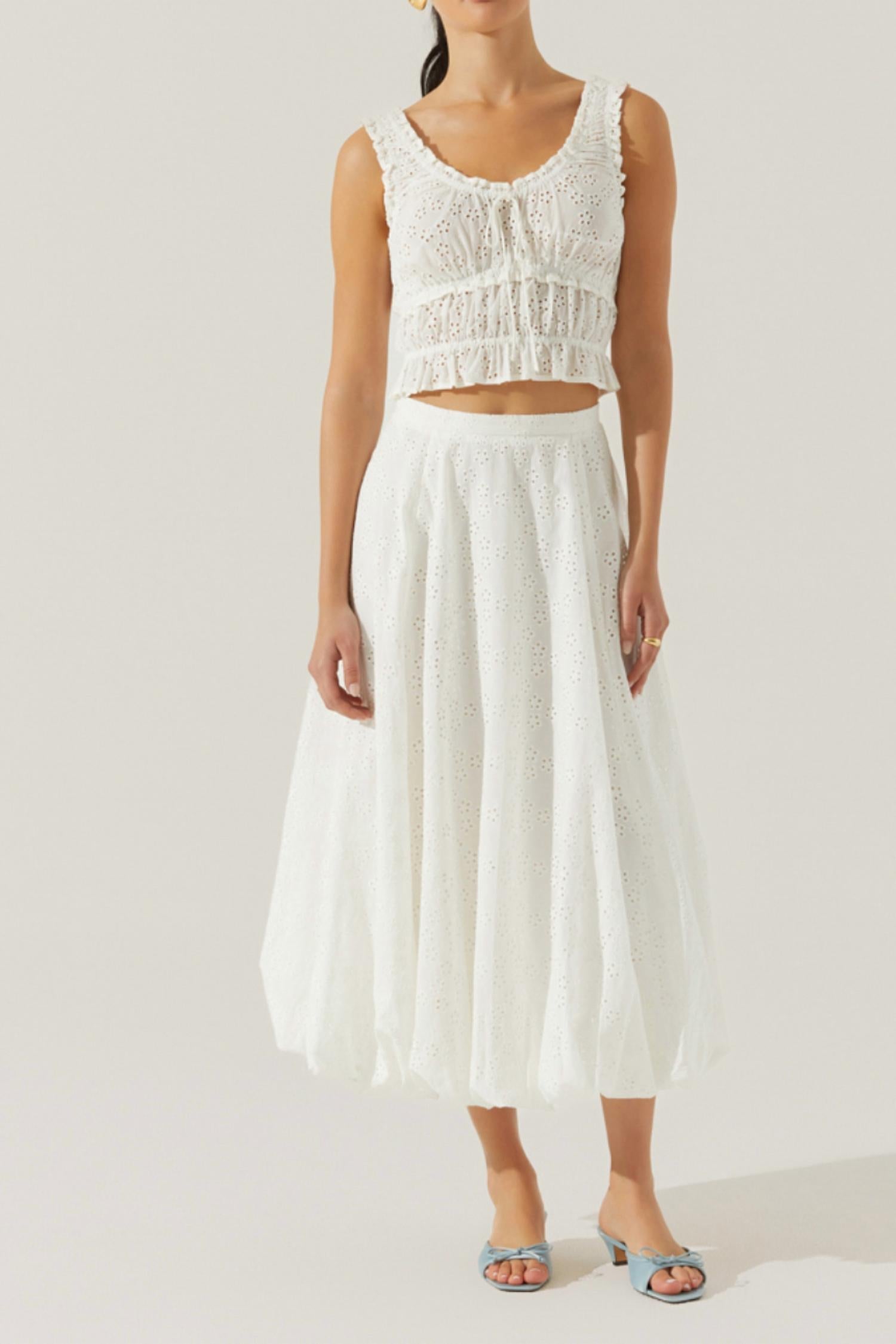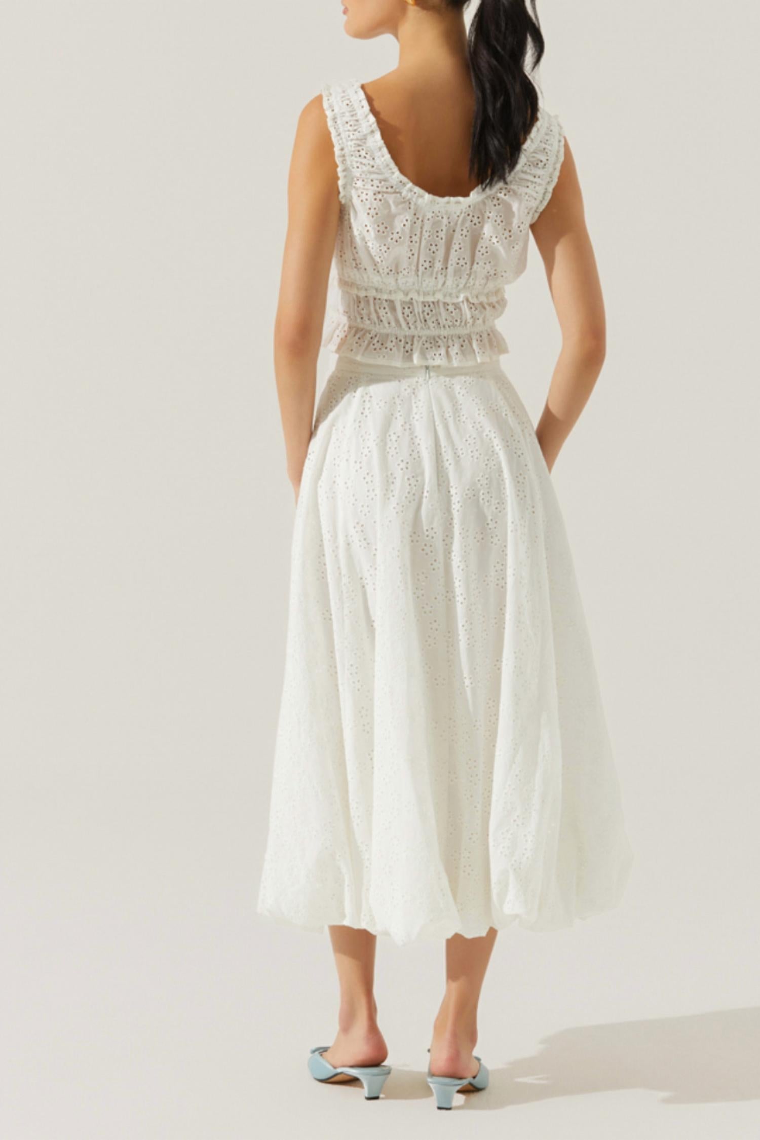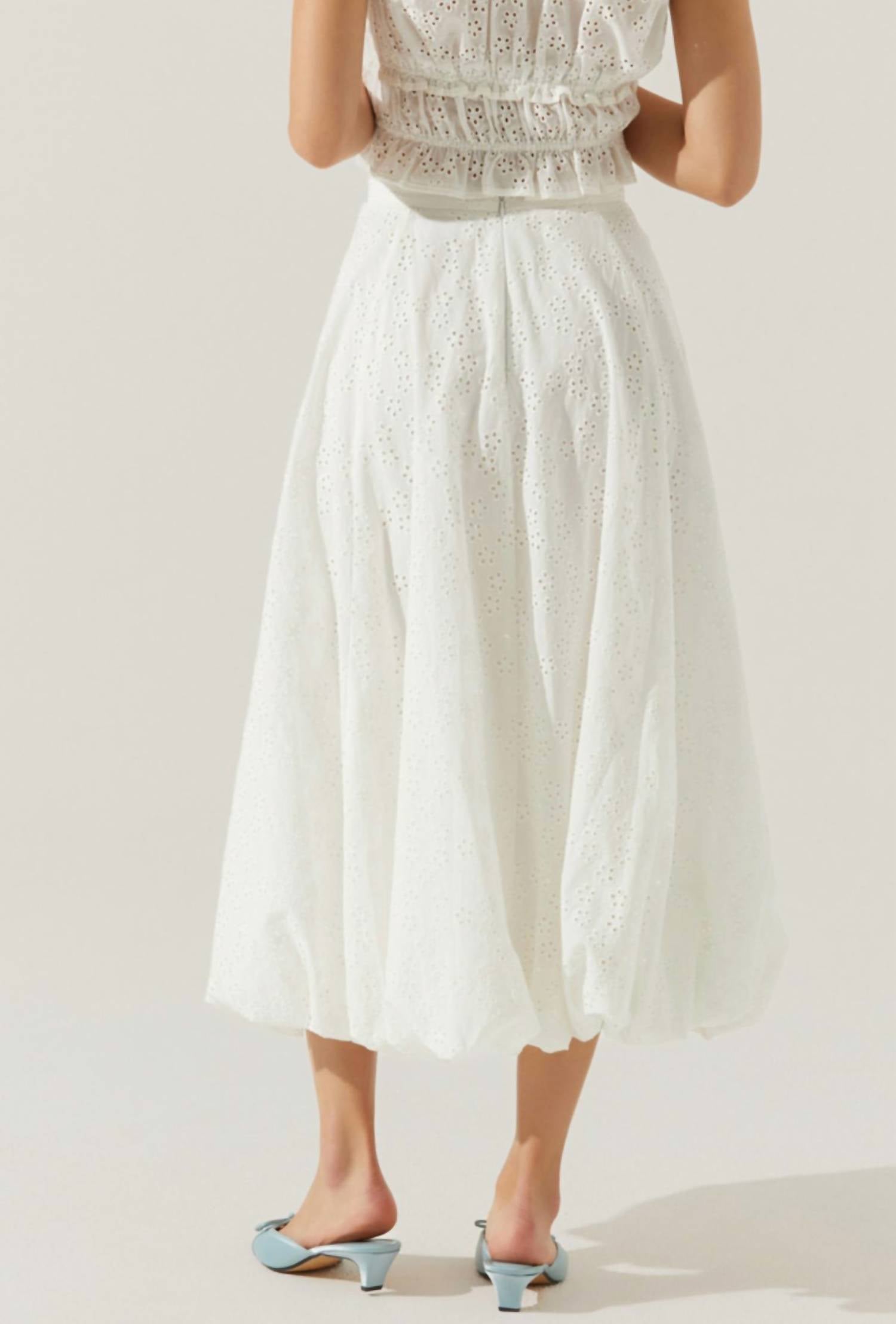 The midi length skirt is here to stay and we especially love this style. Elevate your summer wardrobe with the Women's Kissel Skirt by ASTR, a chic midi designed in a solid white color perfect for boho chic trends. This stylish piece is crafted from 100% cotton with a delicate allover eyelet pattern, complemented by a unique bubble hem for added flair. It features a convenient back zipper closure and is fully lined with 100% rayon for comfort. Ideal for vacations, it effortlessly pairs with the matching Kissel Top for a complete and fun bridal look.