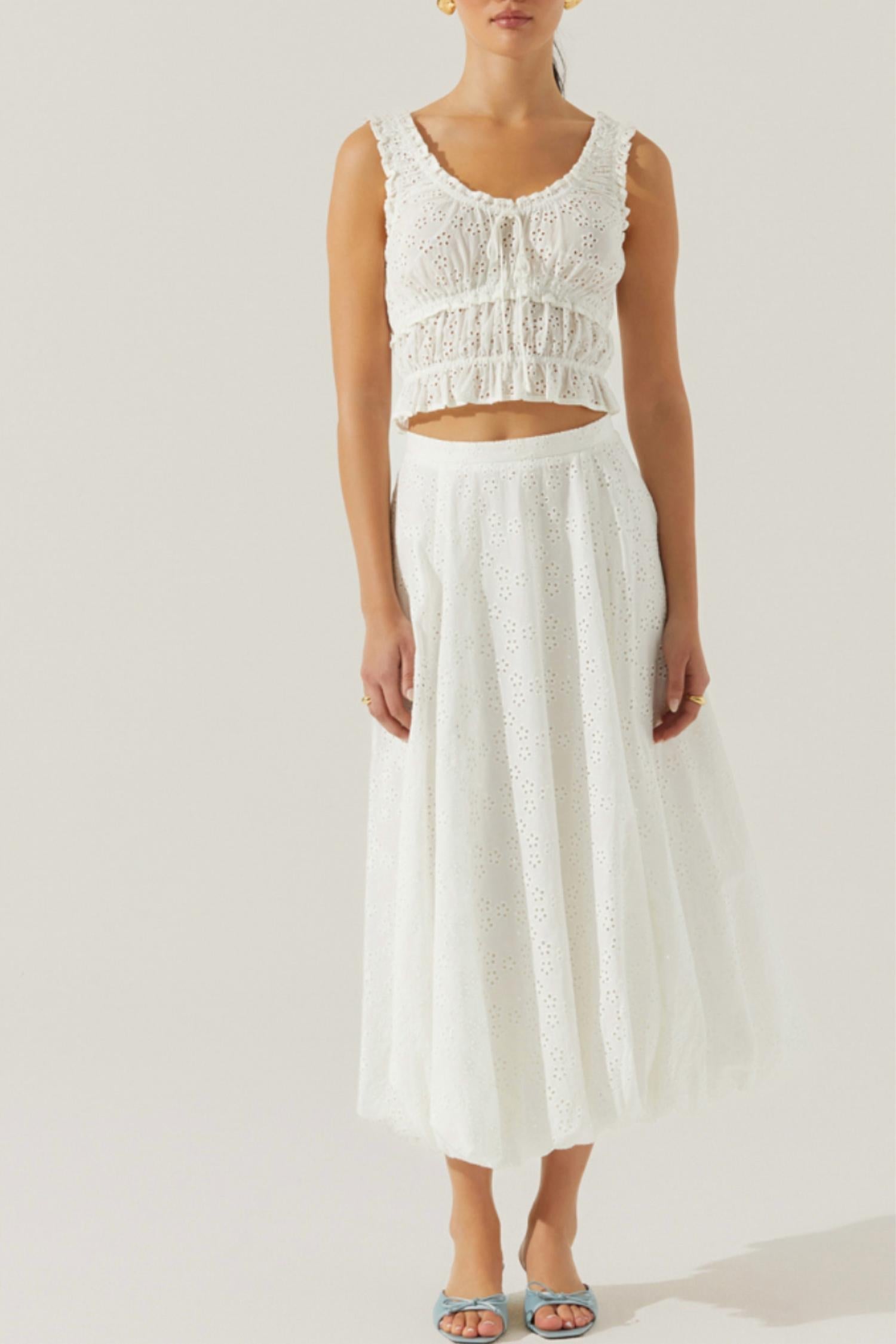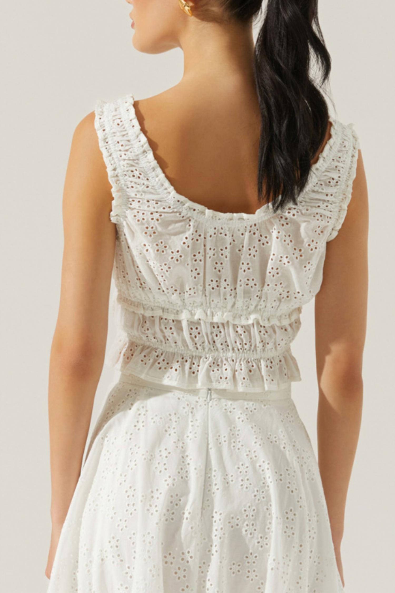 Introducing the Kissel Top by ASTR. Pair this top with its matching skirt for a great bridal look. eyelet cropped sleeveless top Smocked design, includes decorative self tie detail at center bust Ruffled trim details along sleeves, neckline, & hemline Floral print on an eyelet cotton fabric Dry clean only Self: 100% Cotton / Contrast: 100% Rayon