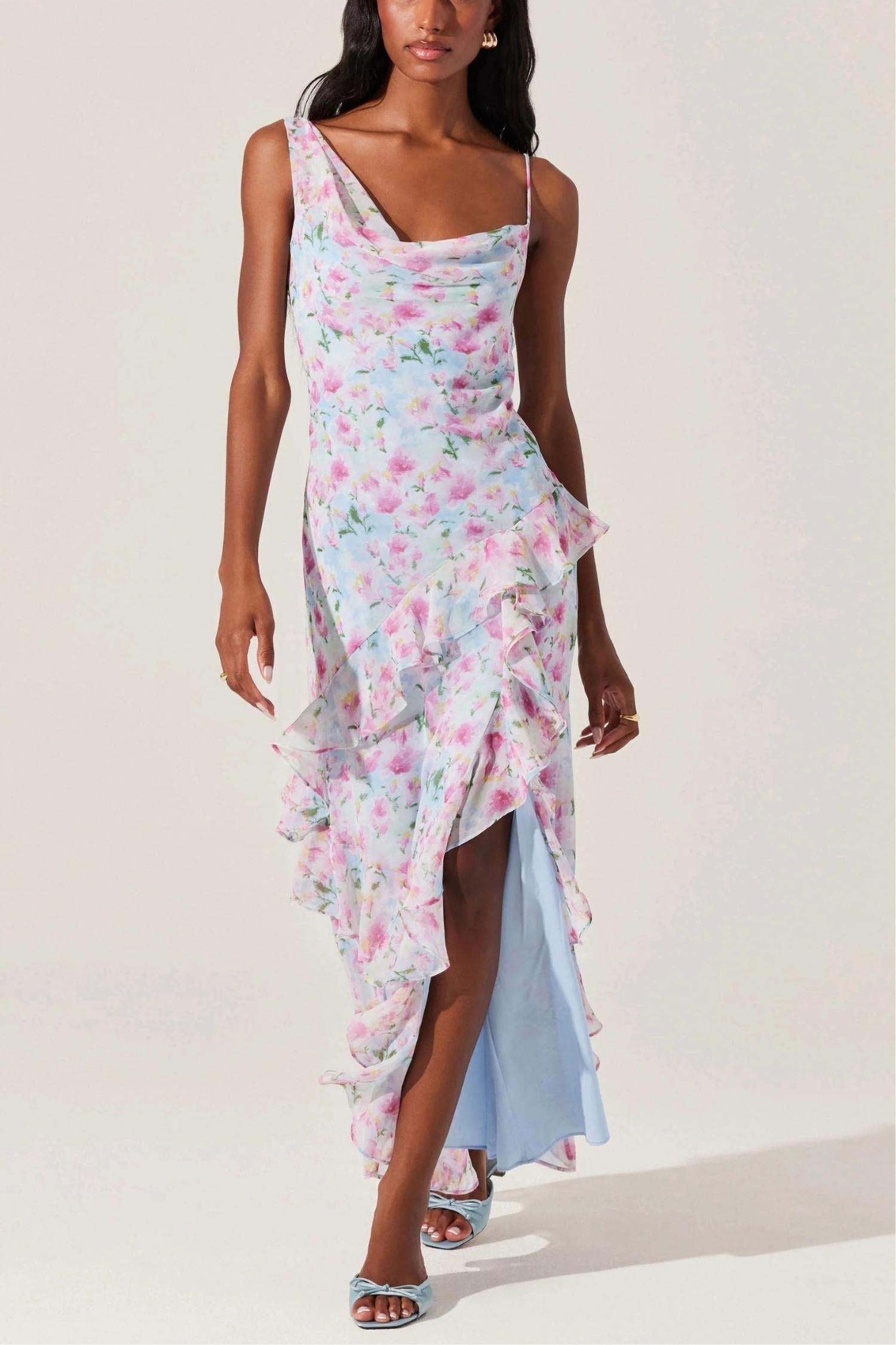 Introducing the Women's Levina Dress by ASTR, a quintessential choice for your summer wardrobe. This sleeveless, asymmetrical dress in a multi-color floral pattern highlights a maxi length with a cowl neckline and one adjustable strap for a custom fit. It features a tiered ruffle trim and an alluring above-knee left leg slit, with full lining for comfort. Crafted in 100% polyester with a lining blend of 97% polyester and 3% elastane, it includes a concealed side zipper closure and requires dry cleaning only.