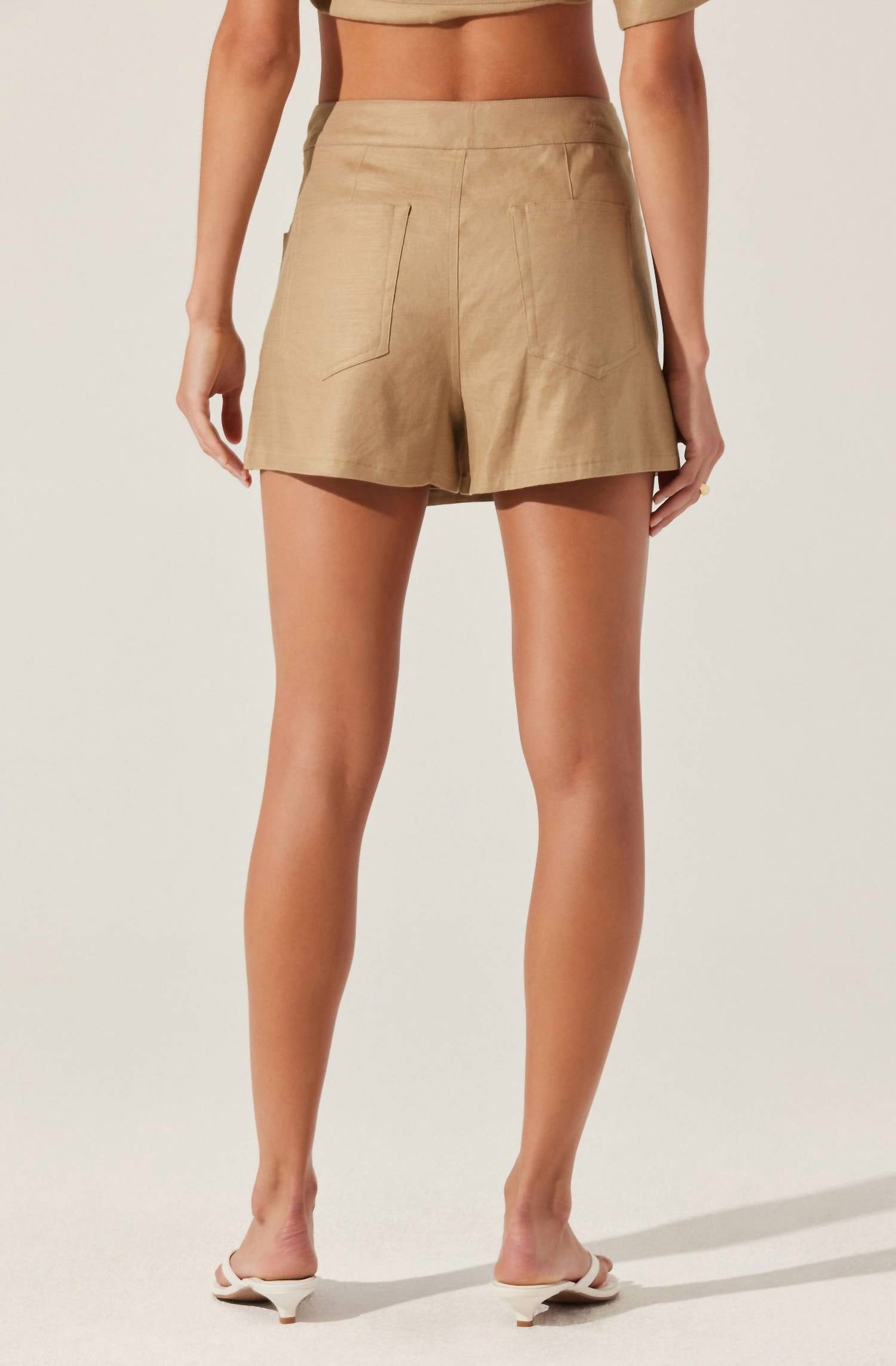 The cutest skort that combines style and functionality. Elevate your summer wardrobe with the ASTR Wrap Skort in a flattering khaki hue. Crafted from a chic linen blend, this skort features a sleek button closure and practical pockets for seamless style and functionality. Designed with a minimalist aesthetic, it's a solid choice for vacation-ready looks. Care for it by dry cleaning to maintain its pristine condition.