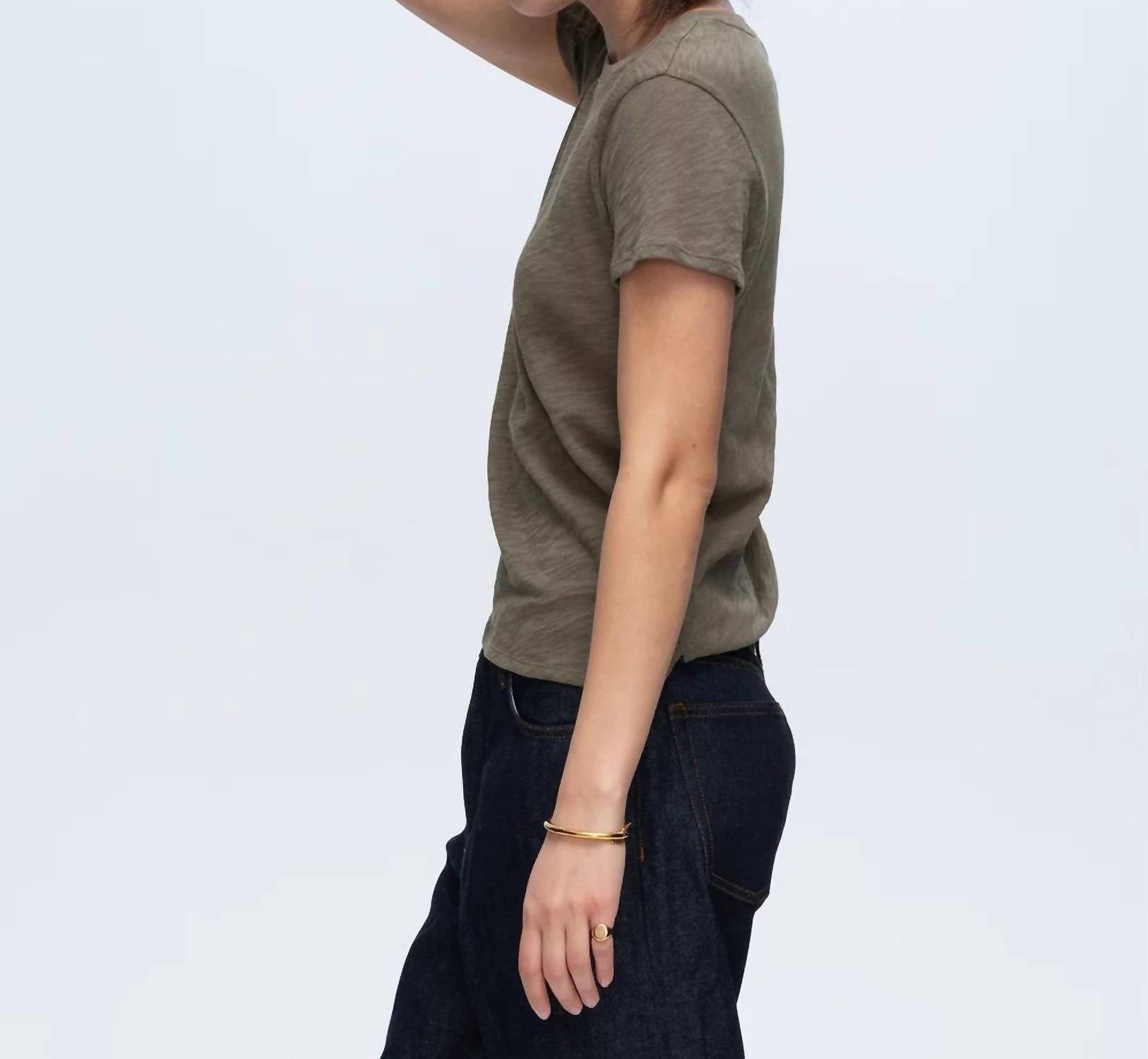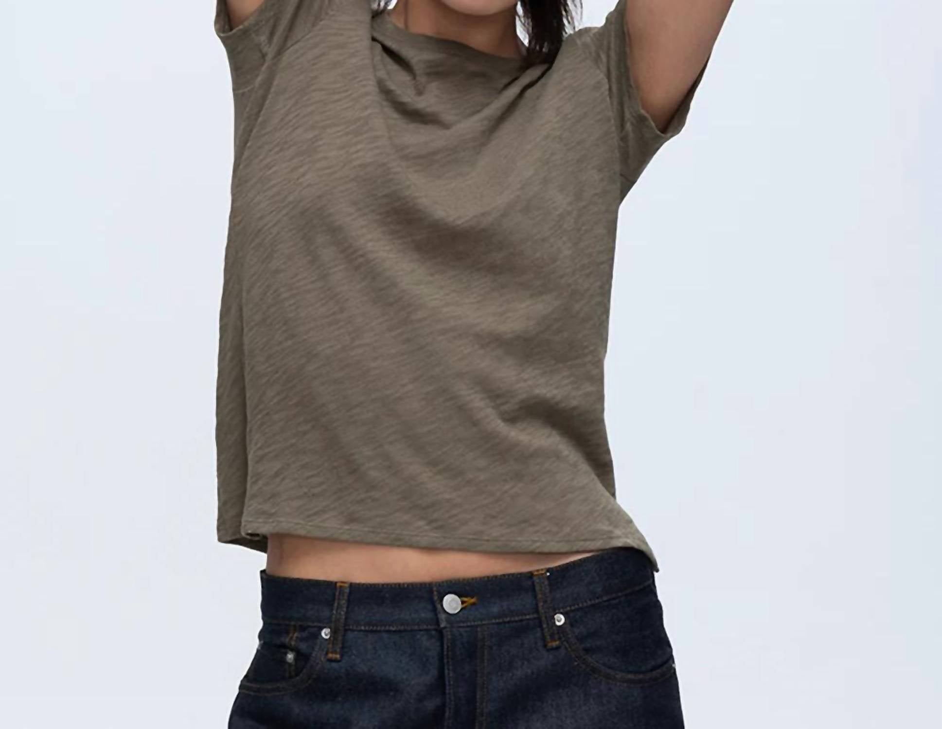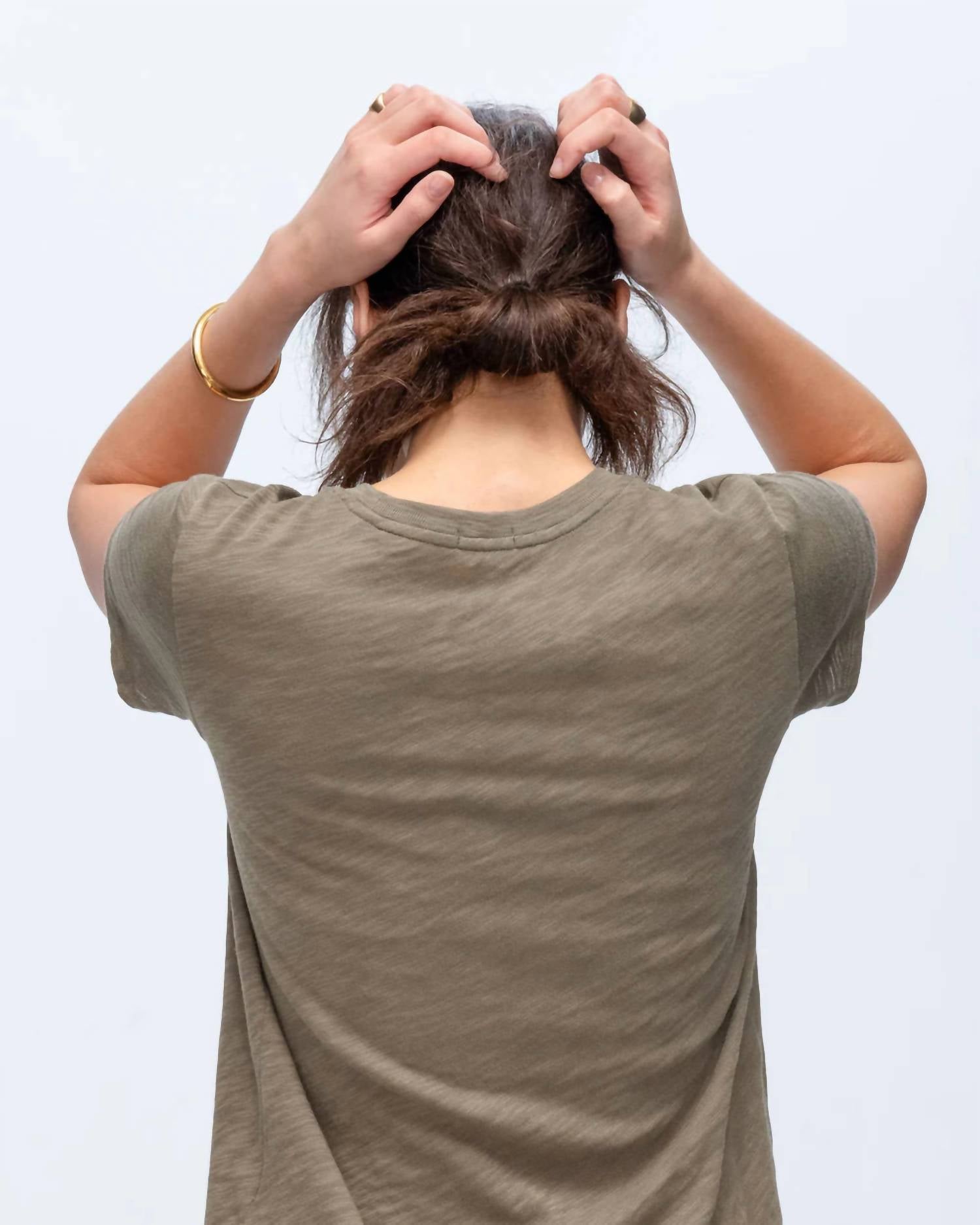 Introducing the ATM Schoolboy Crew Neck Tee in a streetwear-inspired Army hue, perfect for travel and summer vibes. This women's tee features a short sleeve design and a relaxed crewneck silhouette crafted from unique, textured Peruvian Cotton. Closure is effortless with a pull-on style, and the tee is solid in pattern without any pockets. Care is simple with instructions to machine wash and tumble dry, ensuring ease for your on-the-go lifestyle.