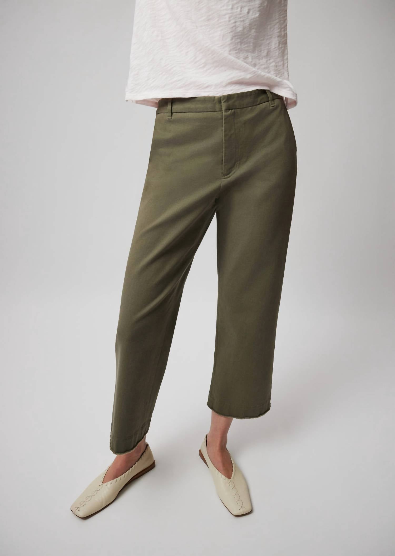 Softly tailored trouser features a wide leg silhouette with a flat front and frayed hem. With a medium-rise waistband, zip fly and belt loops with hook-and-bar closure. Fabric: 98% Cotton, 2% Spandex. Machine wash cold. Model is 5'10.5" and wearing size Small.