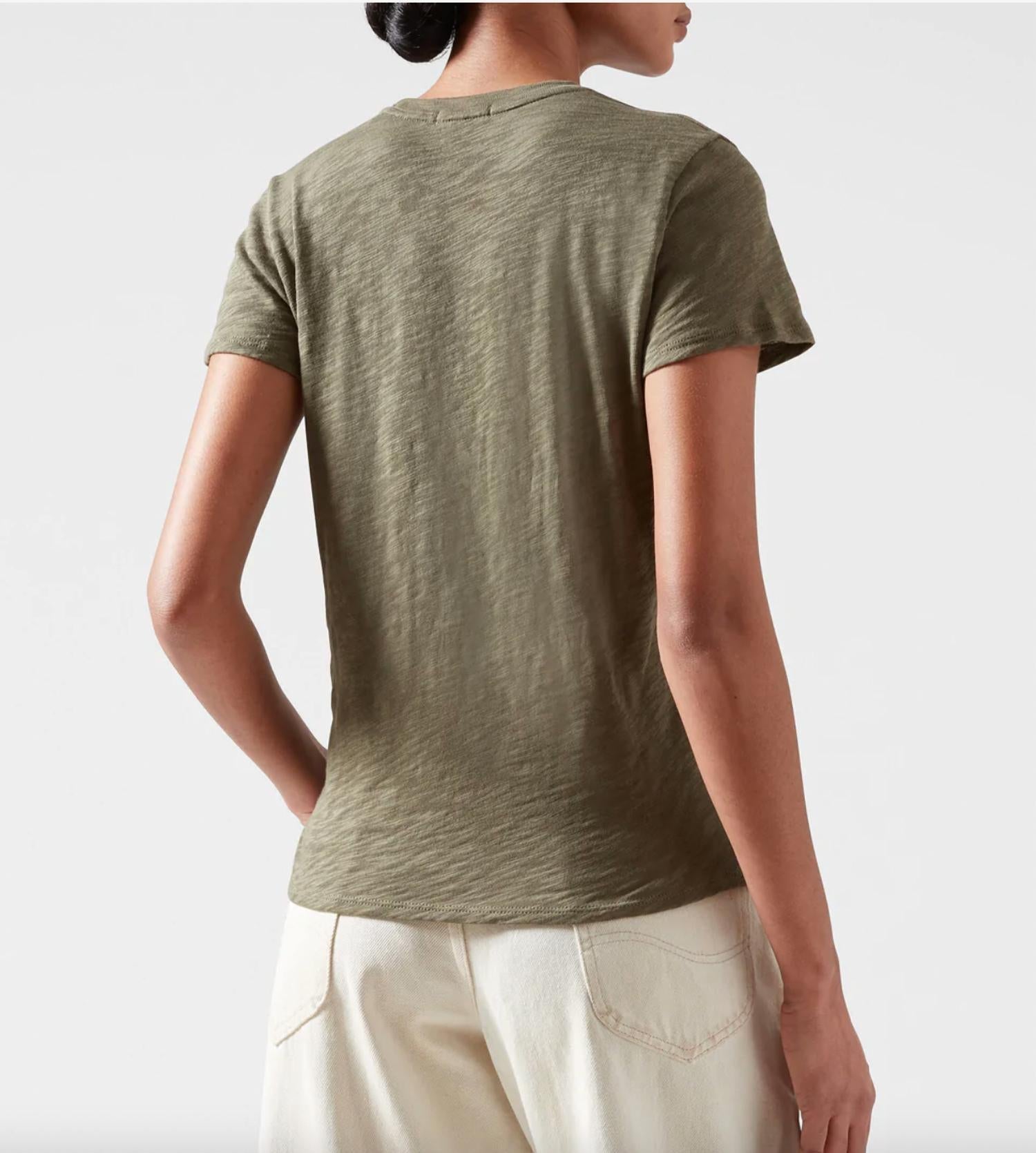 Look no further, you just found your perfect tee! Discover the Schoolboy Slub Jersey Tee by ATM in a striking Army hue, perfect for elevating your casual ensemble. Crafted in a short sleeve design from 100% Peruvian Cotton, this piece features a unique textured fabric that offers a subtly sheer look. The relaxed crew neck and slightly shrunken straight cuts create a flattering silhouette for any woman's wardrobe. Care instructions recommend hand washing in cold water for best maintenance.