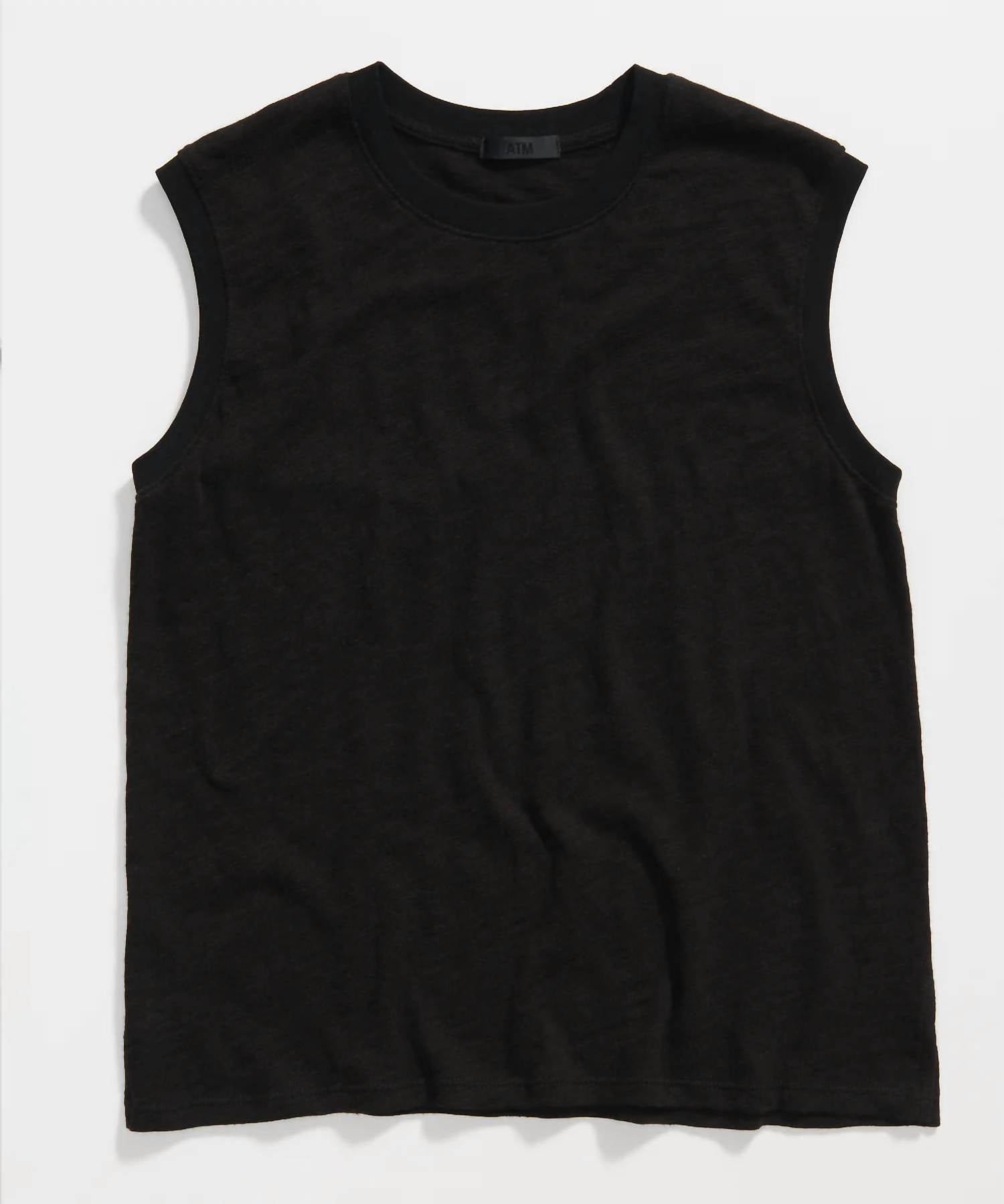 The perfect tank top for those warmer weather seasons. Relaxed crew neck. Sleeveless design. Slightly shrunken straight cut. Made from heavier cotton with loose weave.
