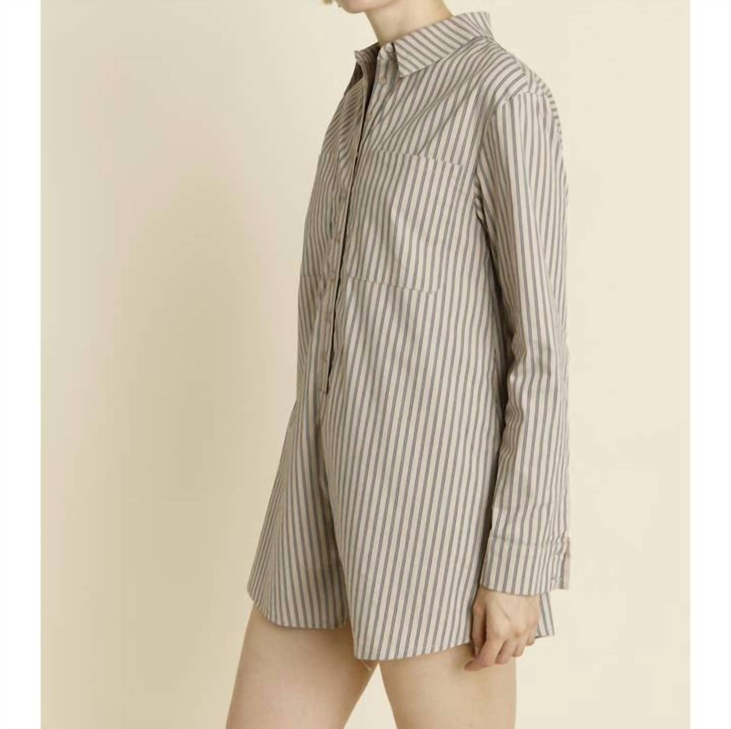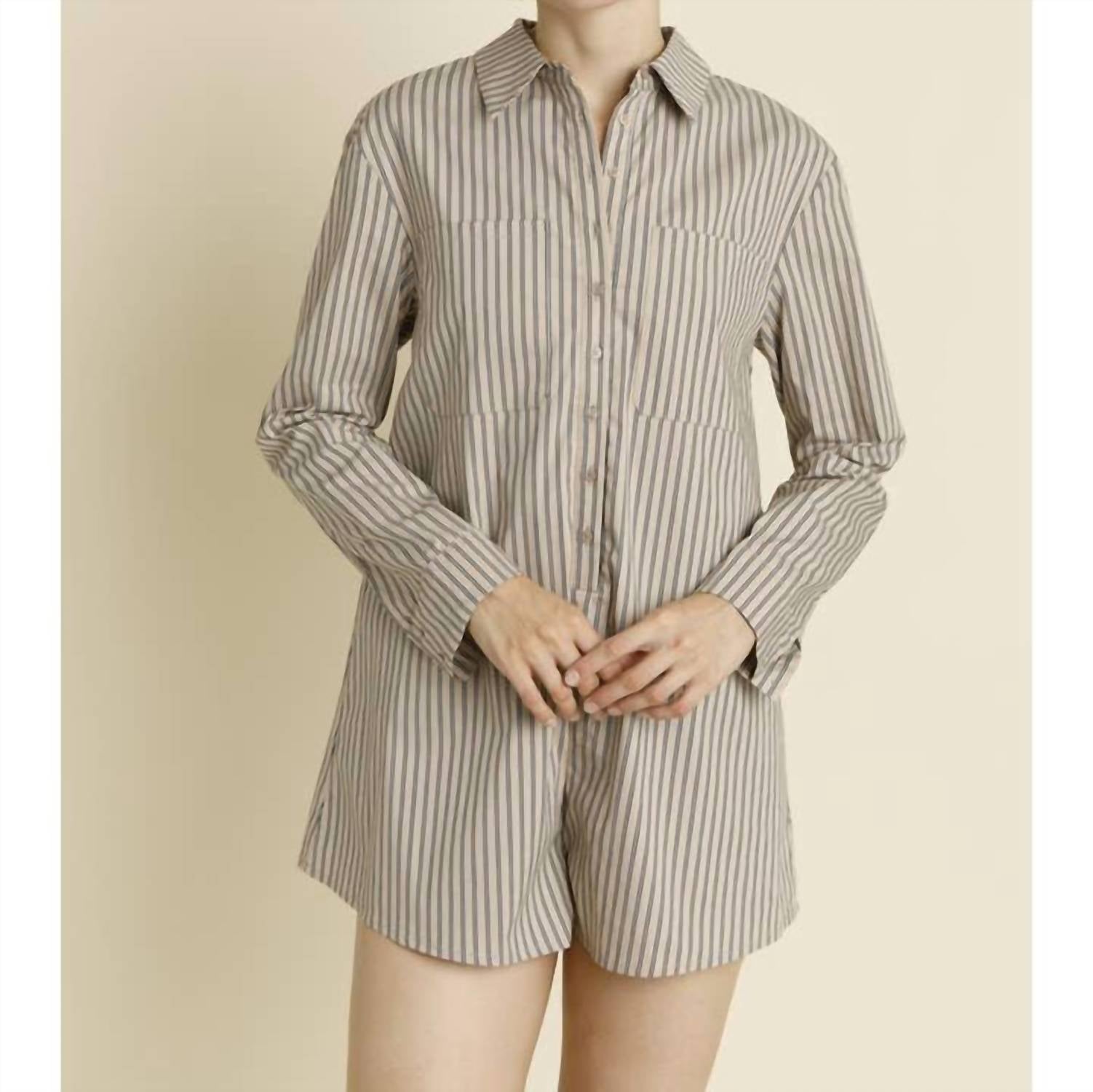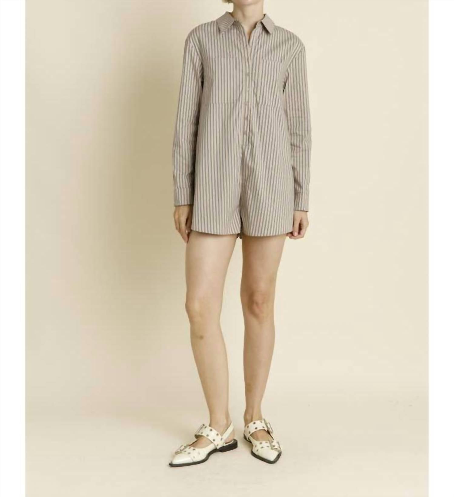 Throw it on and go! Step out in style with the Oversized Striped Shirt Romper by Aureum. This chic romper, crafted from cotton, features long sleeves and a classic tan and navy striped pattern. Designed with a collared neck and convenient front square pockets, it offers a comfortable and boxy fit. Closure: Button closure, making it a perfect choice for effortless streetwear or a Thanksgiving holiday party.