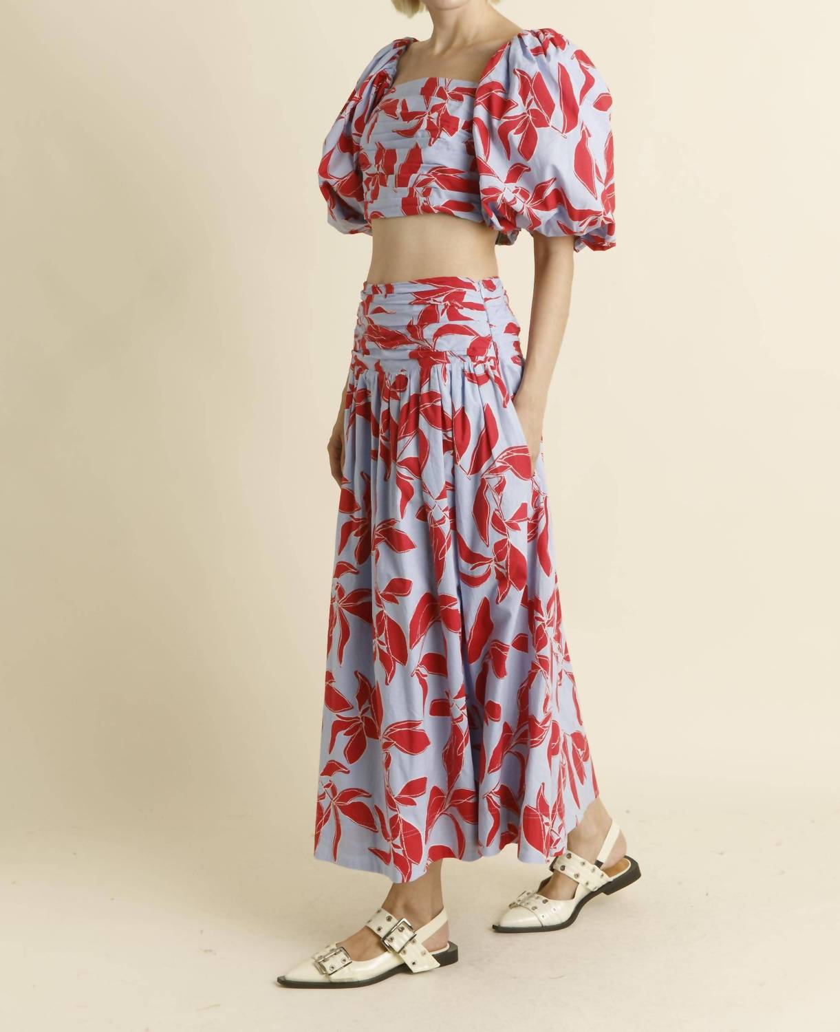 Tuck your favorite tee into this midi length skirt for an effortlessly cool look. Embrace boho chic style with the Shirred Midi Skirt by Aureum in vibrant blue and red floral print, perfect for your spring vacation wardrobe. Expertly crafted from non-stretch cotton poplin, this skirt offers comfort with its shirred waistband and practical side seam zipper closure. The fully lined design adds elegance, while the inclusion of pockets ensures functionality. Model is 5'9" and wearing a size Small.