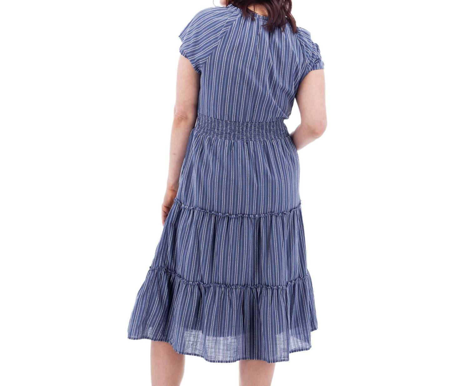 Step into elegance with the Aventura Colmar Stripe Dress, featuring short sleeves and crafted from 100% organic cotton dobby in a Coastal Fjord stripe. This midi-style dress has a 46-inch length and a smocked waist, offering a comfortable and flattering fit. Designed in the USA with a pull-on closure, it includes practical hip pockets and a lined tiered skirt for added style and functionality. Care instructions are simple: machine wash cold, tumble dry low, and apply a warm iron if needed.
